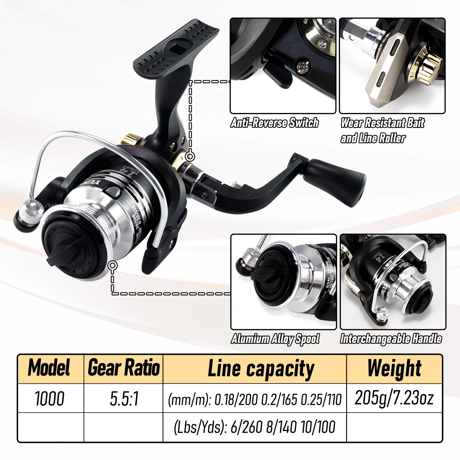 [Carrete DS1000]: El cuerpo principal está hecho de material totalmente metálico con engranajes de precisión y relación de engranaje 5,5: 1 para un rendimiento suave. El carrete viene con asas de metal plegables intercambiables izquierda y derecha. Capacidad de línea (mm/m): 0,18/200 0,2/165 0,25/110, (Lbs/Yds): 6/260 8/140 10/100, peso 205g