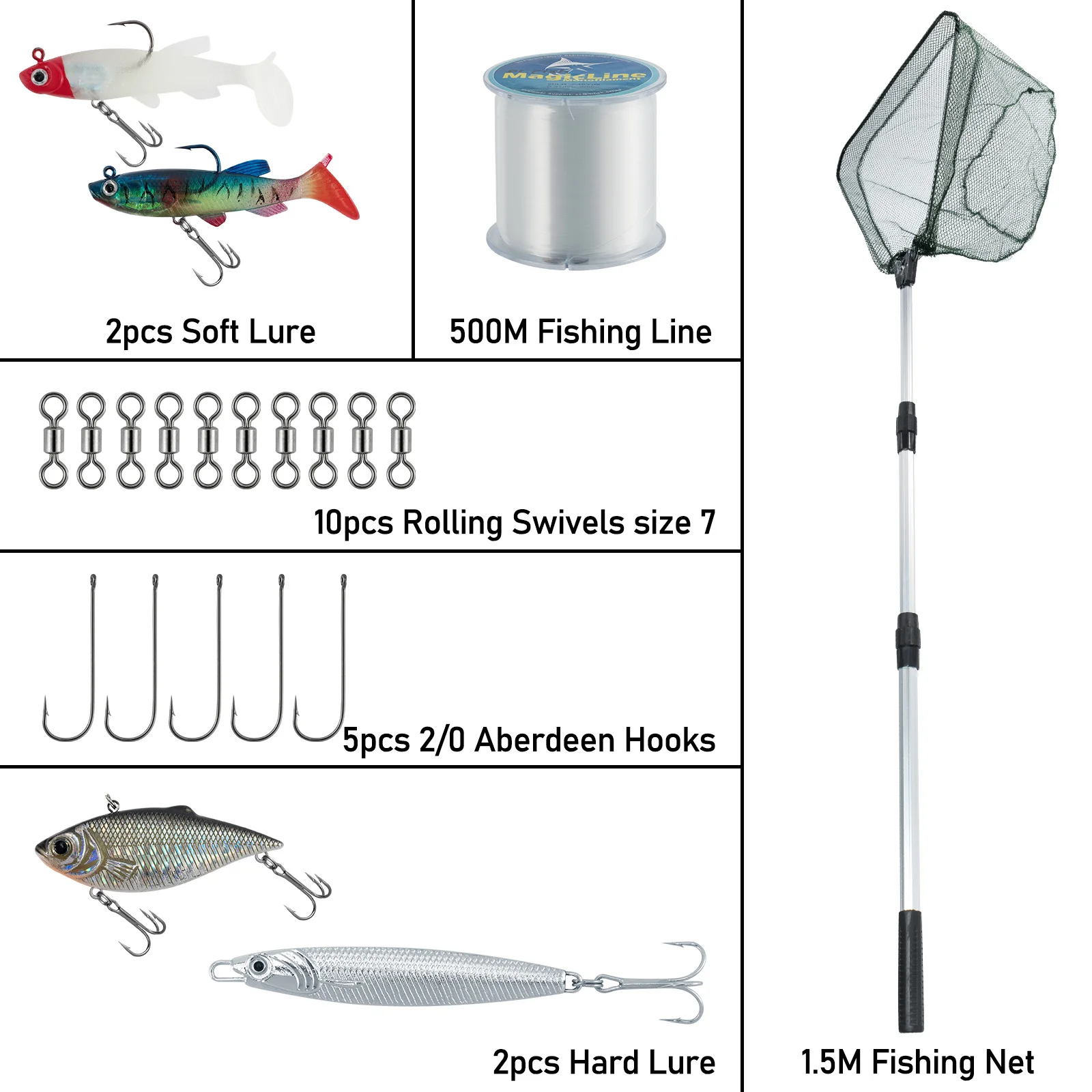 2. Señuelos de pesca, anzuelos, caja de aparejos y red de pesca: junto con la caña de pescar y el carrete, este Combo también incluye accesorios esenciales como Señuelos de Pesca, anzuelos, una caja de aparejos, y una red de pesca. Tendrás todo lo que necesitas para comenzar tu aventura de pesca de inmediato.