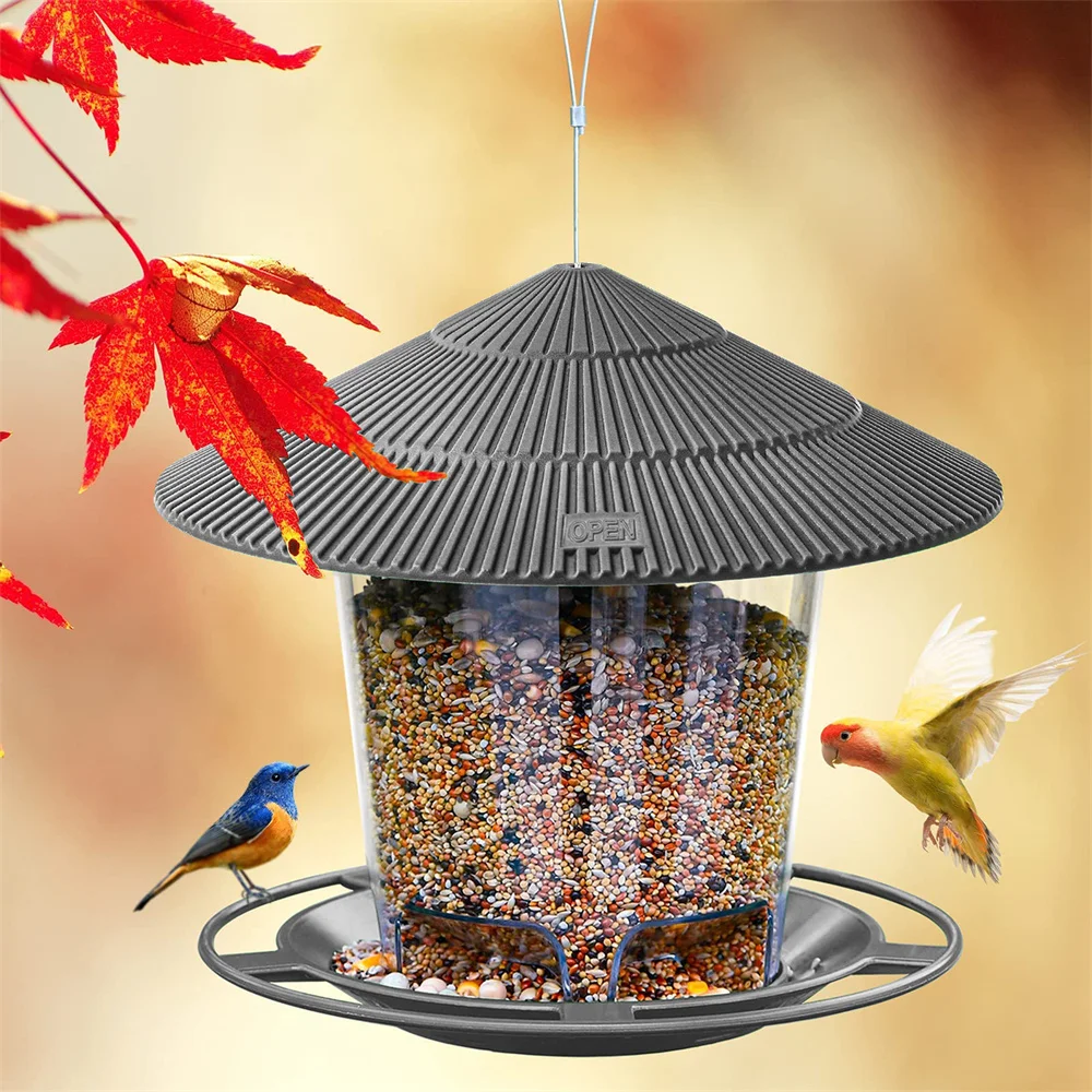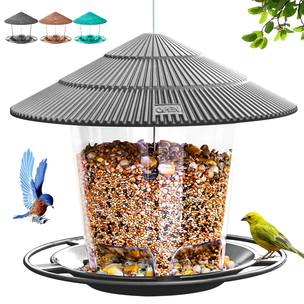 Fácil de usar:Abra la tapa, coloque las semillas de aves silvestres, semillas de girasol para pájaros en el comedero para pájaros, cierre la tapa y luego cuelgue el comedero para pájaros debajo de los aleros o en el jardín.