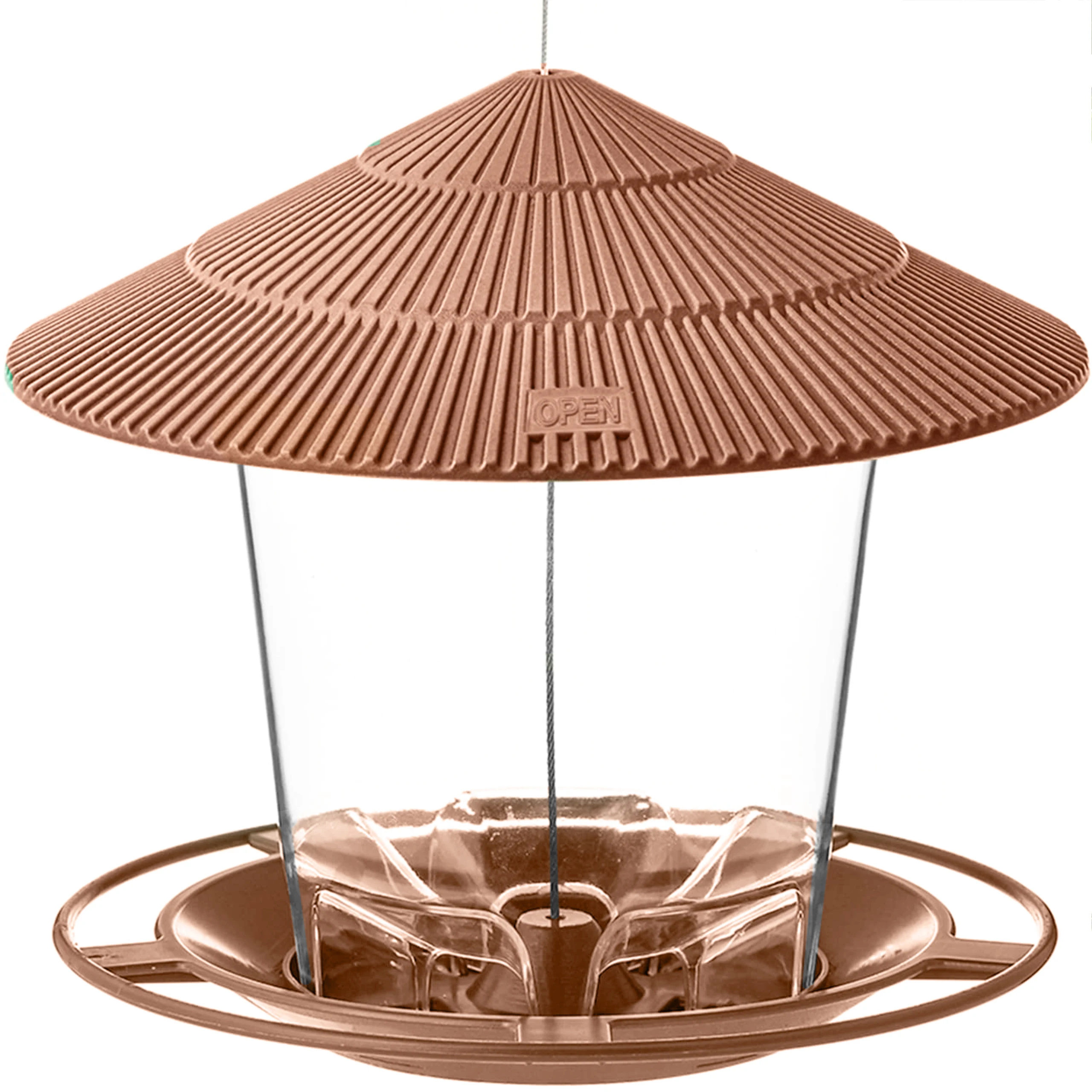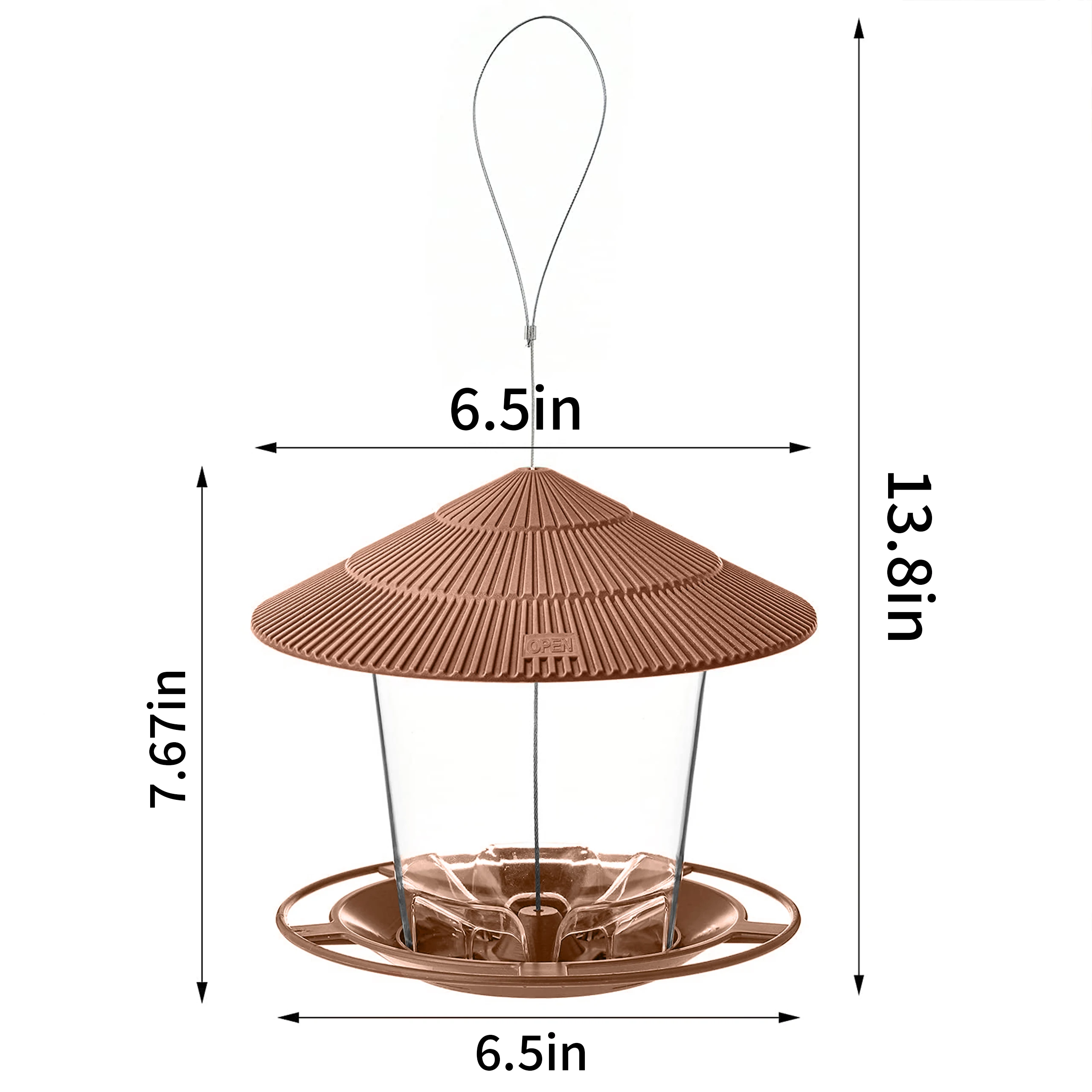 Gran Capacidad:13,8x6,5x7,67 pulgadas. Hecho de plástico duradero y de alta calidad. El plástico transparente facilita la inspección de los niveles de semillas de aves. Contiene hasta 47 oz de semillas de pájaro. La gran apertura permite una fácil recarga y limpieza.