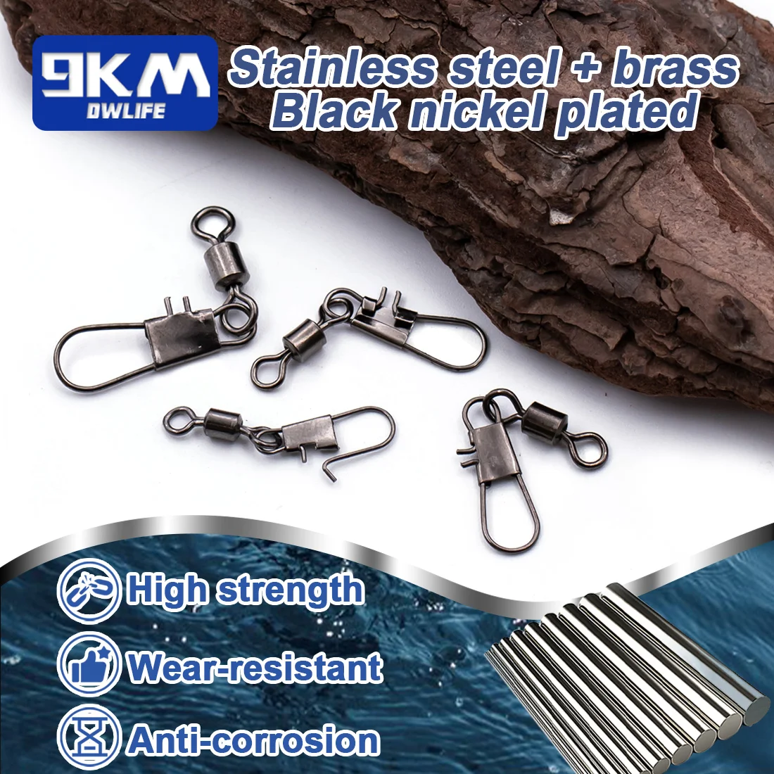 Material: Swivel material is copper; snap material is stainless steel, high quality metal with plating treatment, not easy to resistance and not rusty.fishing swivel snap connectors are strong pull, very light, be sensitive to the information during fishing.