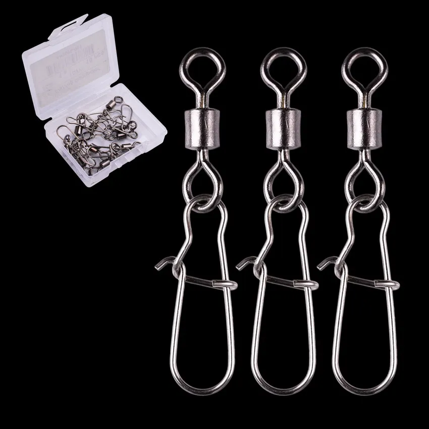 Conector giratorio de pesca de 10 unids/caja, Pin de enclavamiento, anzuelo de acero inoxidable, accesorios de pesca
