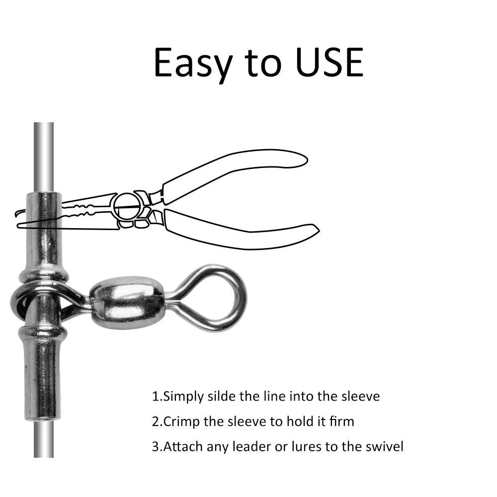 Fácil de usar:Simplemente deslice la línea en la manga y luego engarce la manga para mantenerla firme. Luego coloque cualquier líder o señuelo en el eslabón giratorio.