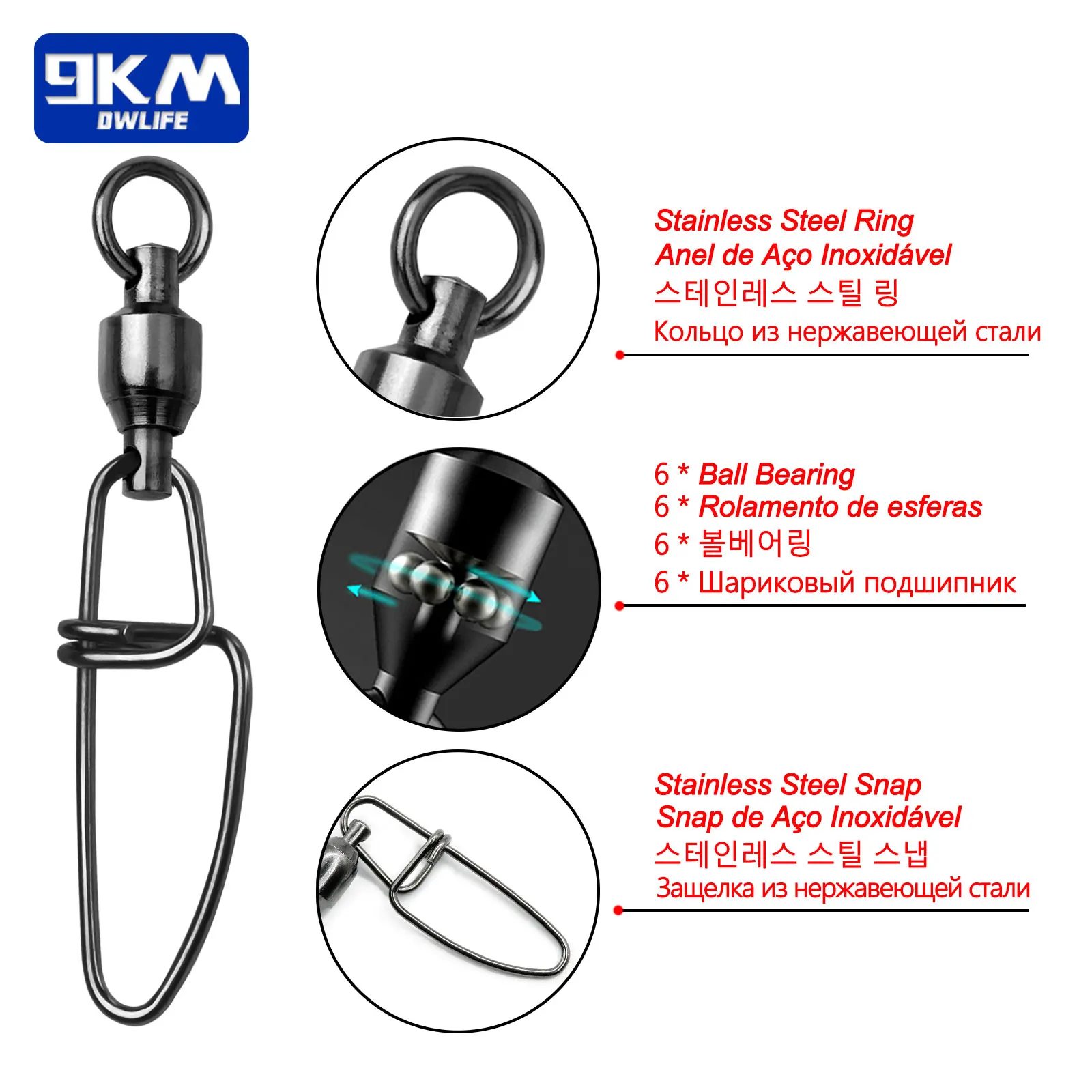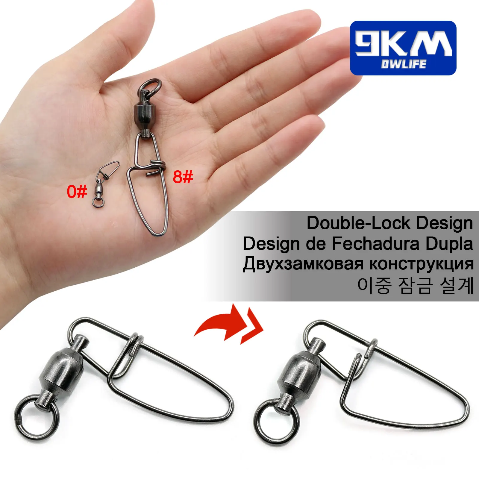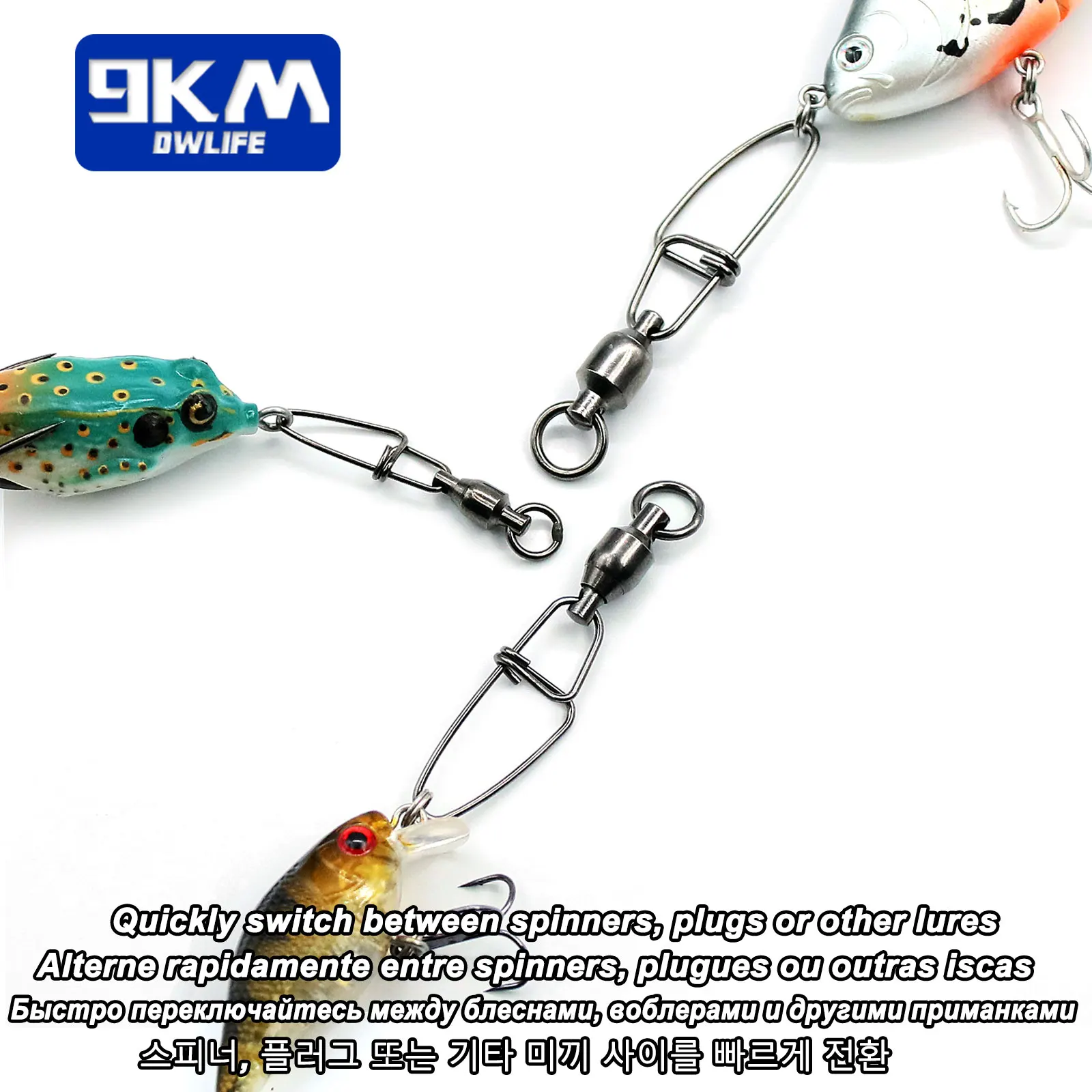 [9KM DWLIFE Ball Bearing Fishing Swivels con Cross Lock Snap] antioxidante, anticorrosión, resistente al desgaste, resistente a los impactos. Cross Lock es fácil de abrir y cerrar, lo que ahorra tiempo a los pescadores al cambiar los Señuelos de Pesca. El diseño único del clip le da a este clip una mayor fuerza de tracción.