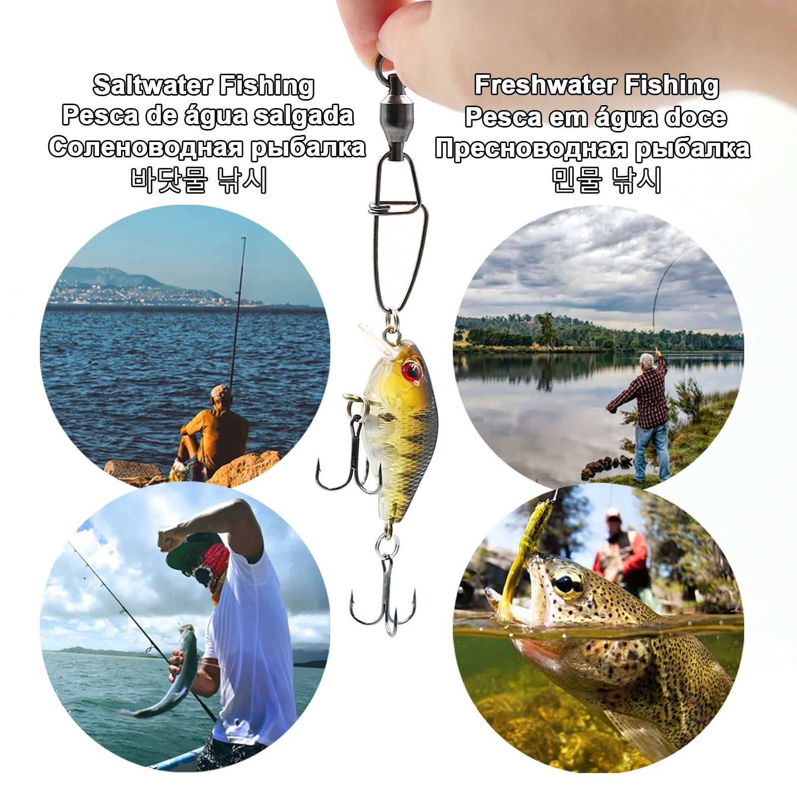 [Adaptado para pescadores] Los eslabones giratorios Cross Lock no solo son adecuados para agua dulce y salada, sino también para la pesca en el mar, la pesca en alta mar, la pesca en la superficie, etc. También se puede utilizar con cebo flotante (flotadores de bagre) y aparejo de aparejo.