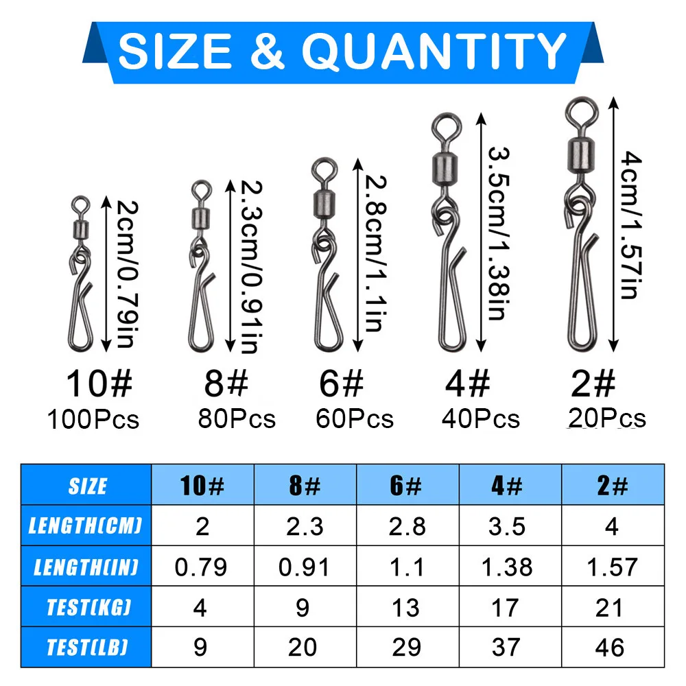 Cantidad: 300 piezas. Material: eslabón giratorio de latón y broche de acero inoxidable Color: Negro Paquete: caja de plástico Tamaño y cantidad: 2 #:20 piezas, 4 #: 40Pcs, 6 #: 60Pcs, 8 #: 80Pcs, 10 #: 100Pcs Características: Resistencia a la corrosión, excelente flexibilidad La superficie no tiene rugosidad, se siente suave Conexión rápida, más conveniente Diferentes tamaños, más opciones Nota: puede haber algunos errores de medición, no se preocupe. Gracias