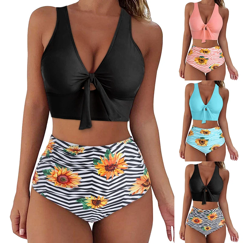 Conjunto de Bikini con estampado Floral para mujer, traje de baño de dos piezas con nudo ajustable, cintura alta, espalda cruzada, cuello en V profundo, novedad de 2022
