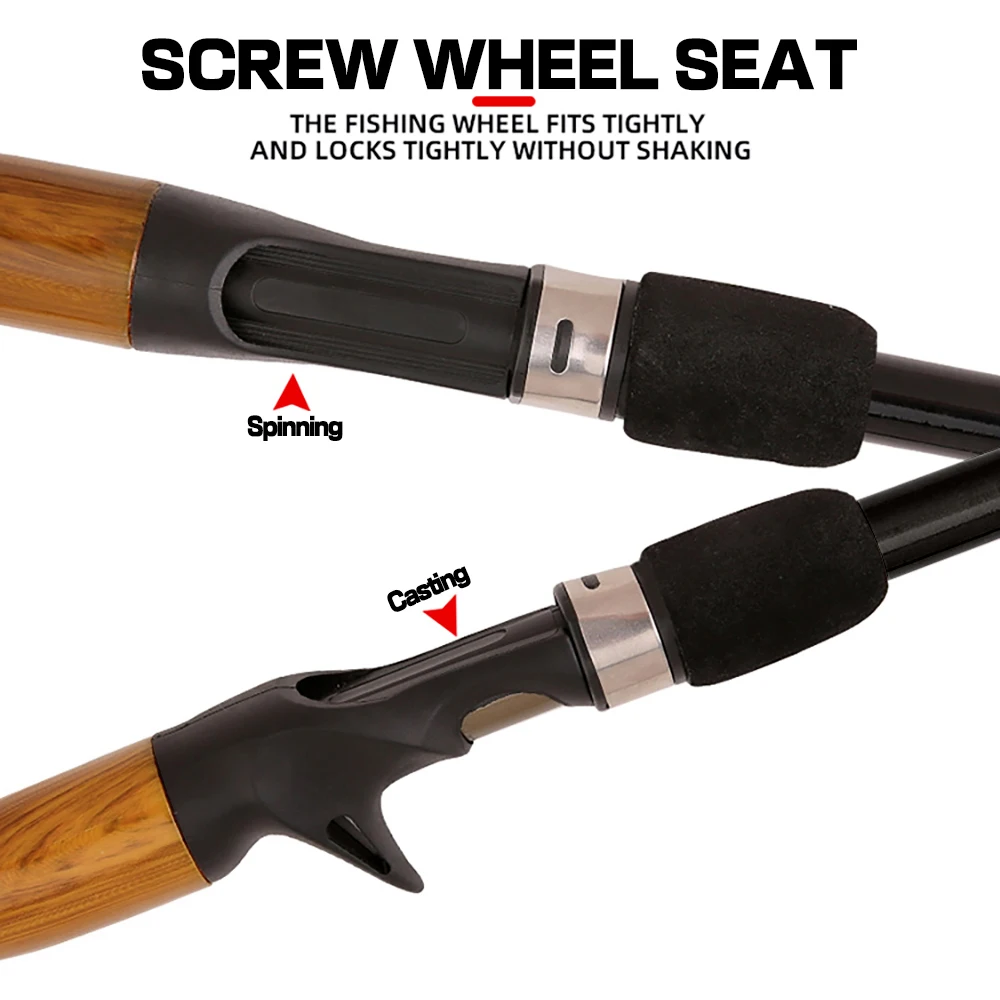 Los suaves anillos guía de cerámica garantizan una fricción mínima para un rendimiento de fundición superior y una mayor precisión. Esta caña cuenta con un asiento de carrete en espiral que proporciona un agarre seguro y cómodo, lo que le permite atrapar grandes capturas con facilidad. El mango de madera maciza no solo es hermoso, sino que también proporciona un agarre cómodo y ergonómico, lo que reduce la fatiga al pescar durante largos períodos de tiempo.