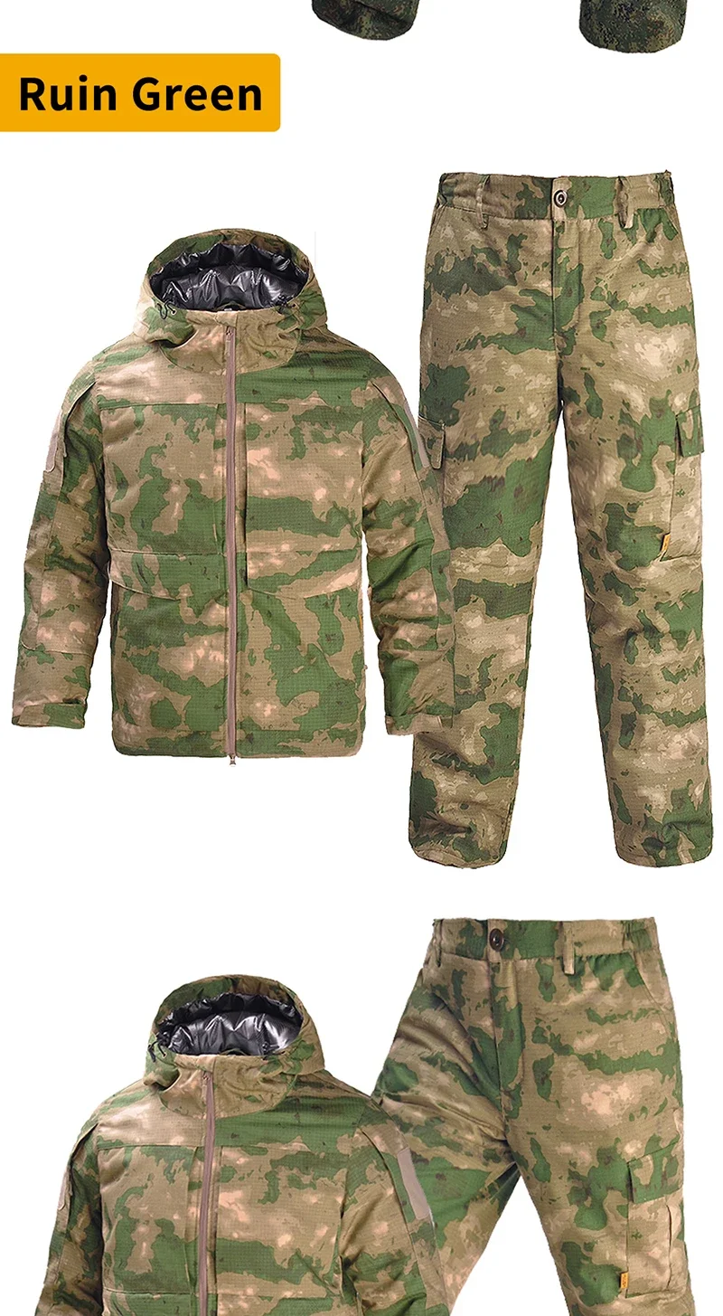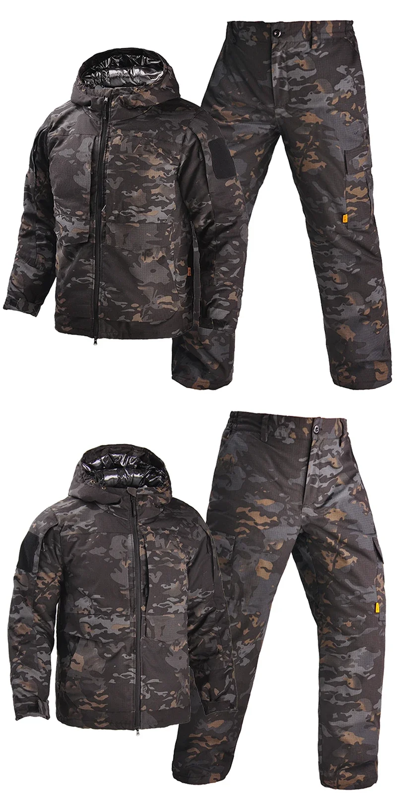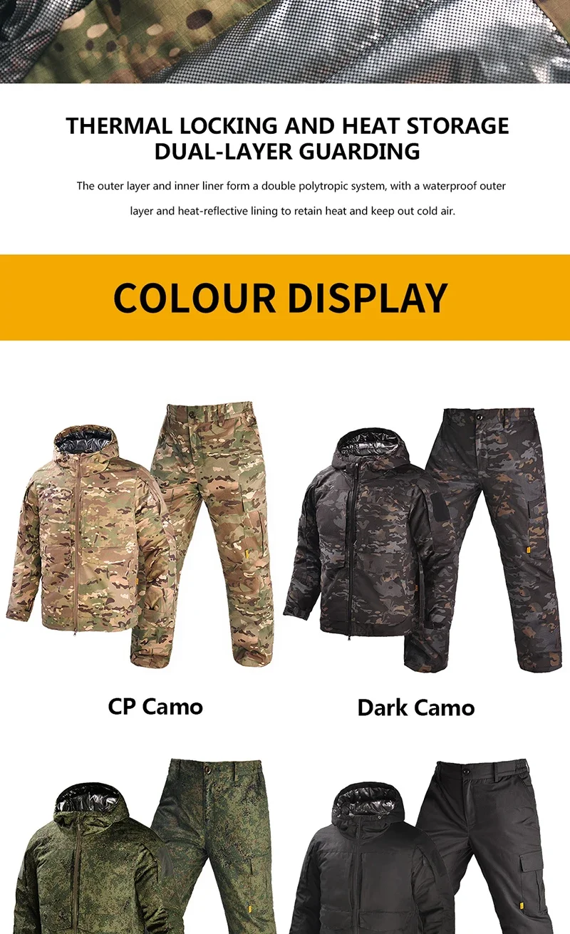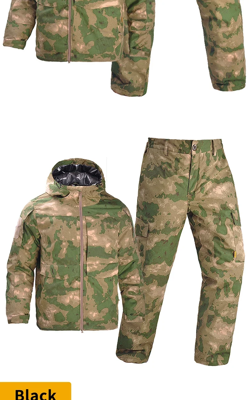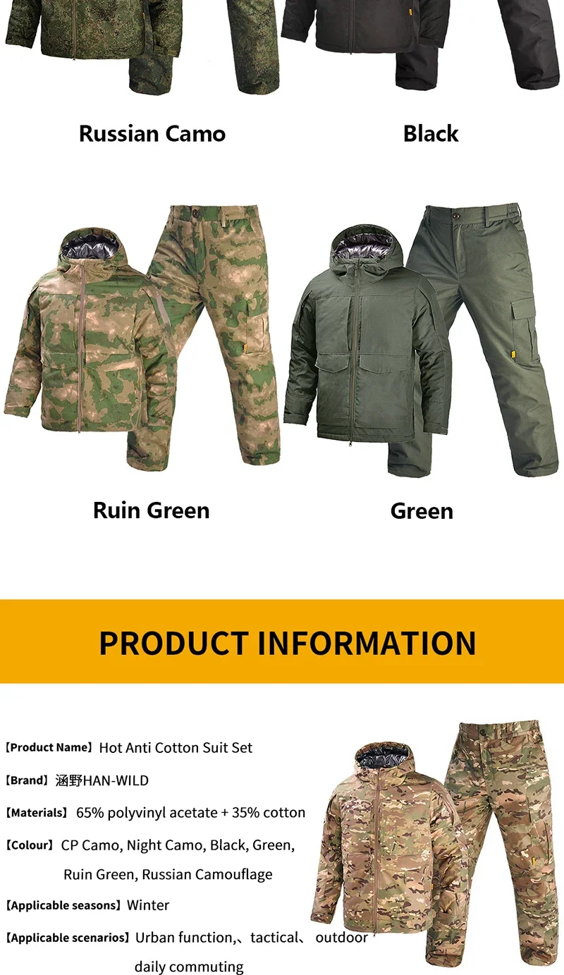 Conjunto de caza al aire libre de invierno, chaqueta gruesa y cálida con reflejo de calor, pantalones de escalada, ropa de hombre, trajes de uniforme táctico, cortavientosMaterial :65% acetato de polivinilo + 35% algodónCaracterística:Chaqueta: