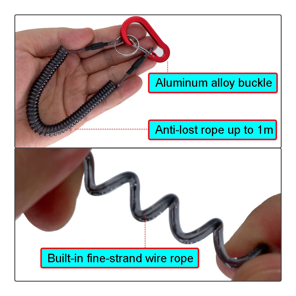 6. Cuerda antipérdida de alambre de acero integrada, conectada con mosquetón de metal para evitar pérdidas.