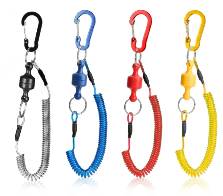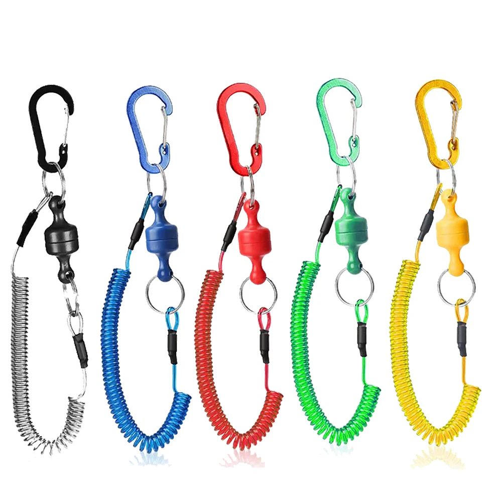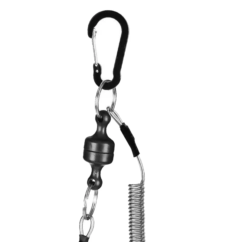 Cordón de bobina de pesca de 1,5 m, hebilla de gancho para pesca con mosca, Clip de liberación magnética fuerte, estante de red con herramientas de pesca, cordón en espiral