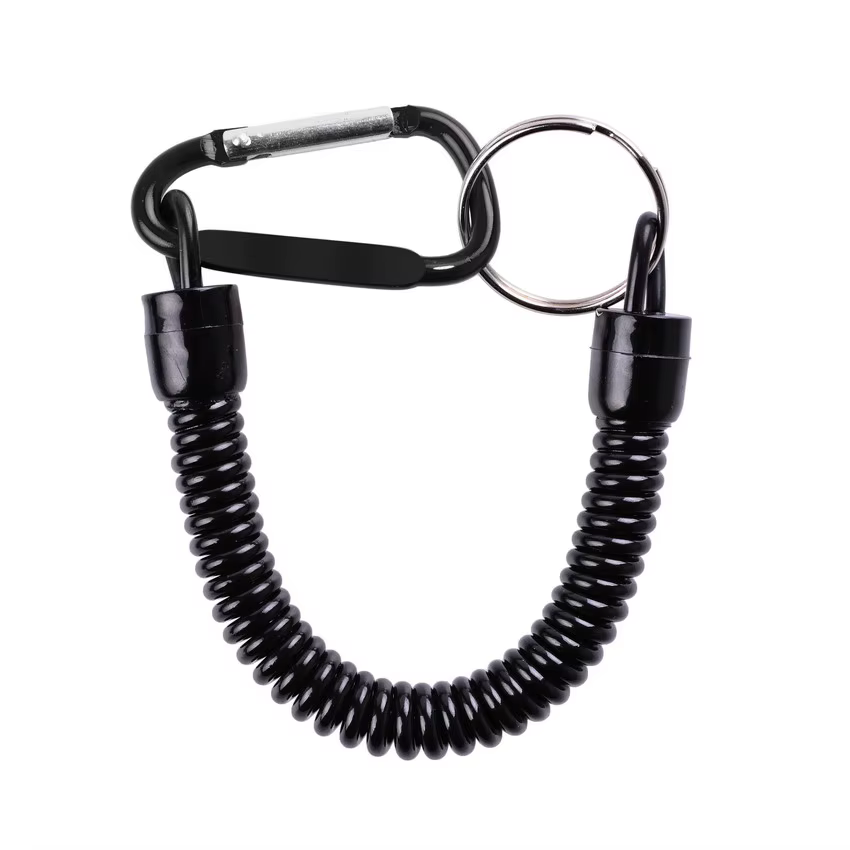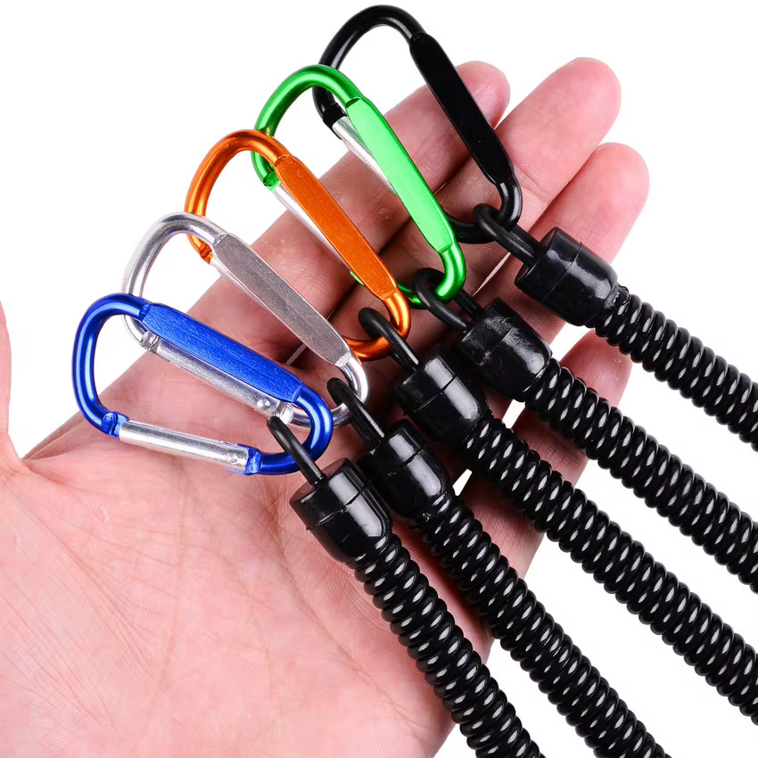 El mosquetón de aluminio en un extremo y el anillo de hierro en el otro extremo pueden sujetar su equipo a su cinturón, barco o kayak
