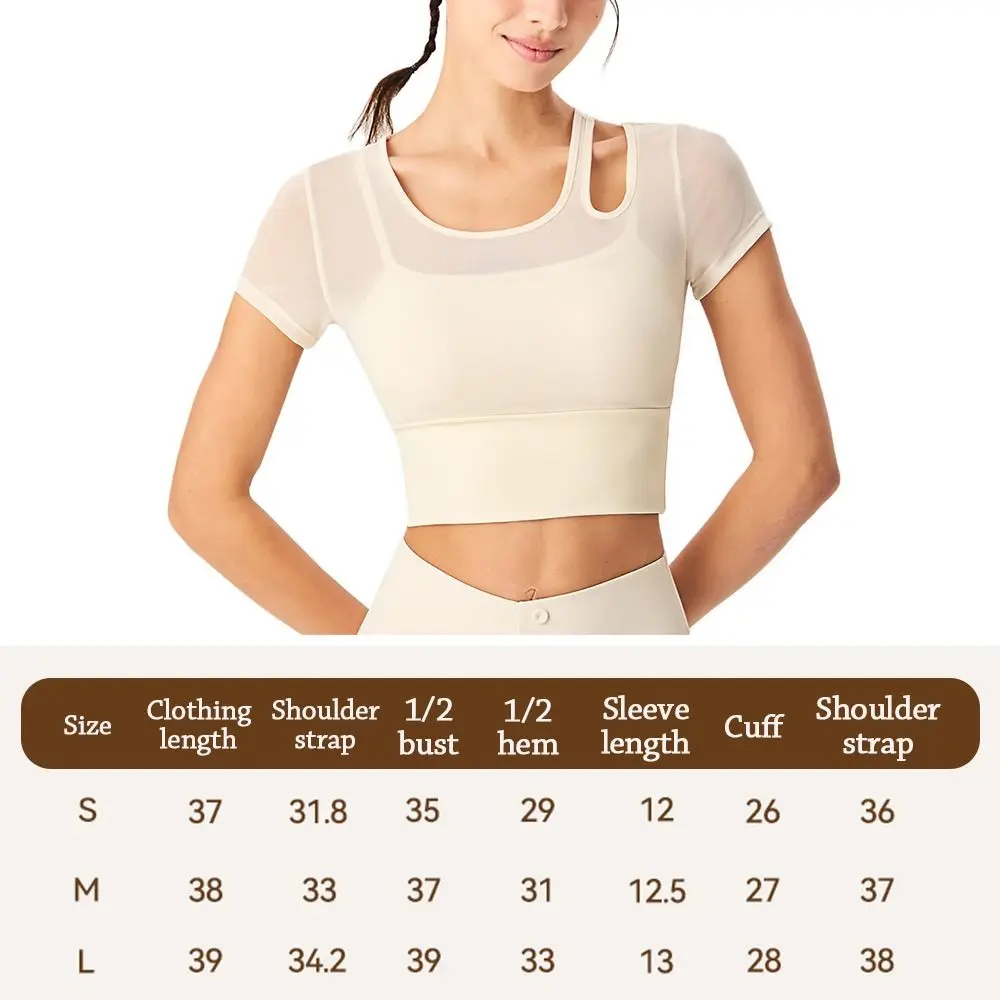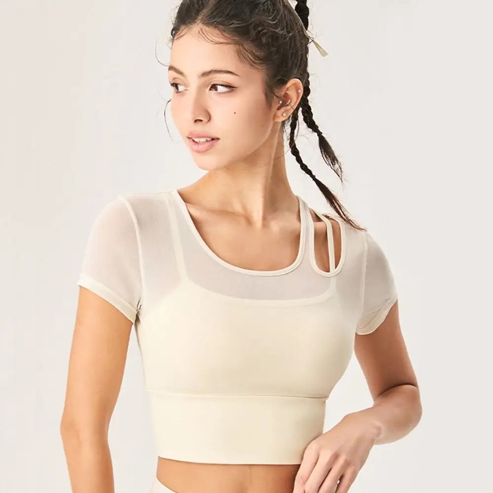 Short-sleeve sports bra/workout top, non-see-through, suitable for various exercises.