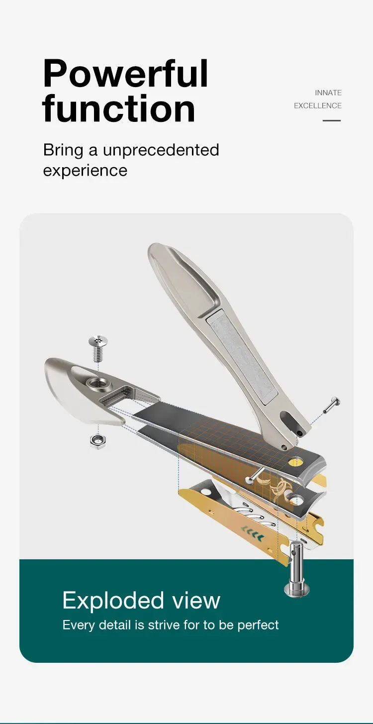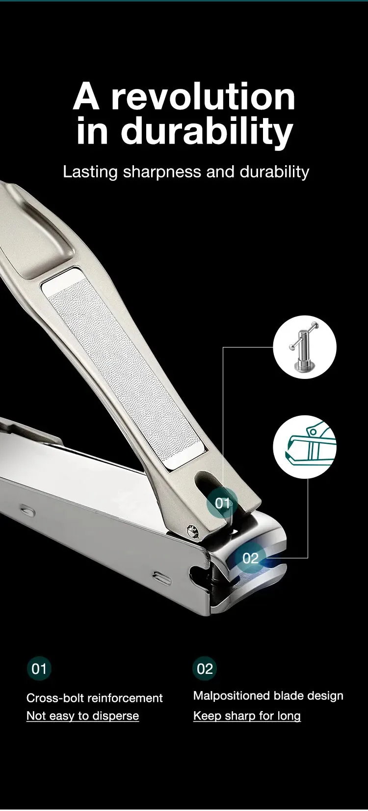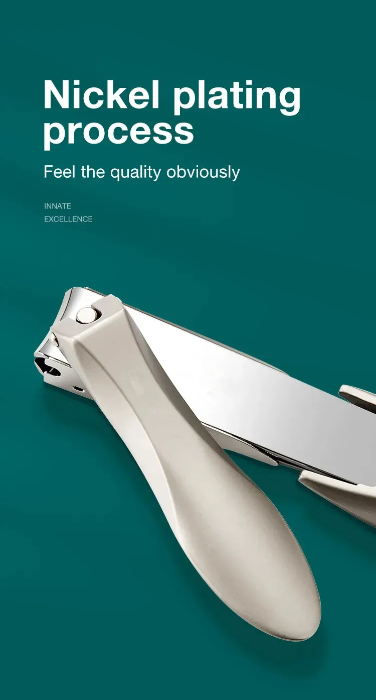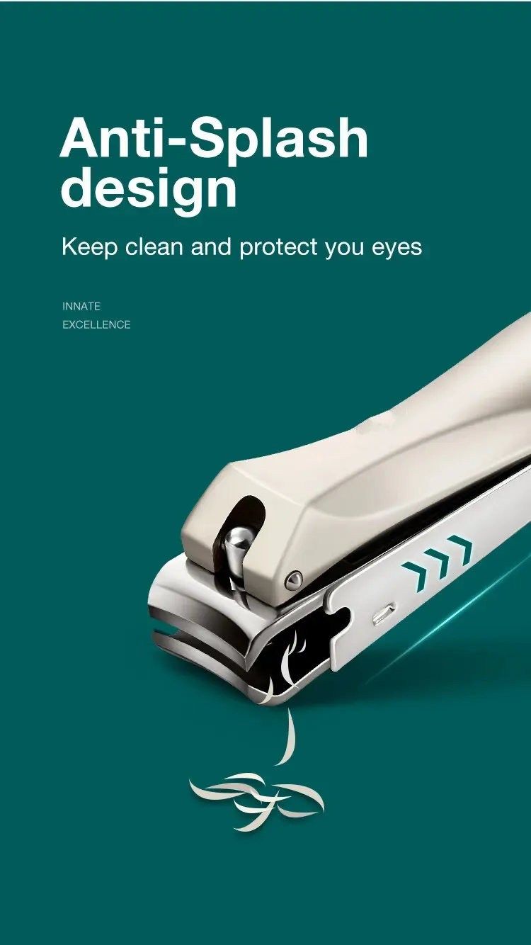 1.Este es un cortaúñas con función antisalpicaduras, que puede prevenir eficazmente salpicaduras de virutas de uñas, facilitar la limpieza y el almacenamiento y prevenir lesiones oculares.