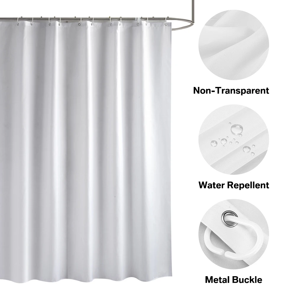 GUARDA PESADA: El dobladillo inferior con peso mantiene el forro en su lugar y reduce la facturación; El tejido de alta calidad le da a este forro de cortina una sensación suave al tacto y cubre muy bien.AGUJEROS REFORCADOS: Los ojales reforzados funcionan con la mayoría de los tipos de ganchos y anillos de ducha para una instalación rápida y sencilla (con ganchos de 12 piezas);El dobladillo superior está reforzado para resistir un uso prolongado y ayudará a que esta cortina mantenga su forma;Esta cortina de ducha complementará cualquier baño, usarla en casa, apartamento, condominio, hotel, caravana, vehículo recreativo, dormitorio, ducha escolar, club deportivo, gimnasio y cualquier otro lugar donde necesite una cortina o forro de ducha confiable.