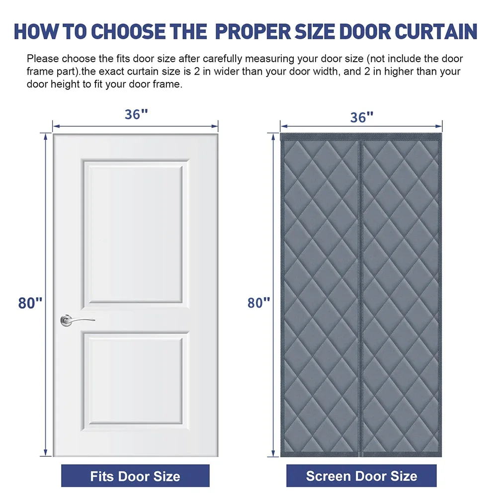 CÓMO ELEGIR EL TAMAÑO: El tamaño de la cortina de puerta aislada es 80/90x205 cm.Mida cuidadosamente el tamaño de su puerta (excluyendo el marco de la puerta).Si el tamaño de su puerta medido es igual o ligeramente inferior a 80/90x205 cm, el tamaño es adecuado