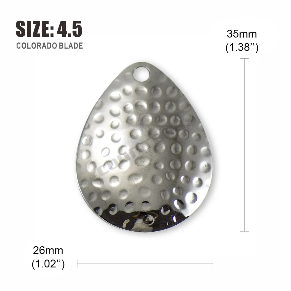 Una hoja de Colorado, la más popular, es la mejor opción cuando necesitas una recuperación lenta y una vibración máxima.También crea la mayor elevación, por lo que es una excelente opción para aguas poco profundas.Perfecto para arneses, spinnerbaits, spinners en línea y muchos otros señuelos.Bordes pulidos suaves que no dañarán tu línea.