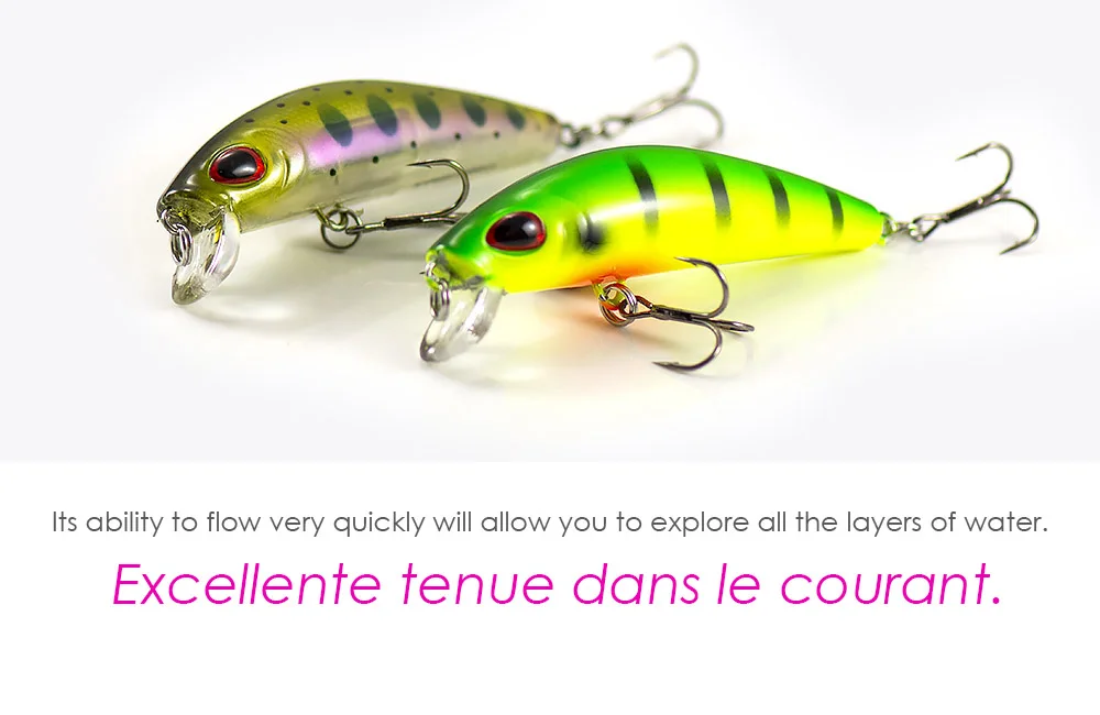 Este pequeño señuelo fluido aceptará muchas animaciones: unos pequeños golpes de la punta la compensarán, imitando así el desordenado nado de un pez panizado.Su capacidad de fluir muy rápidamente te permitirá explorar todas las capas de agua.