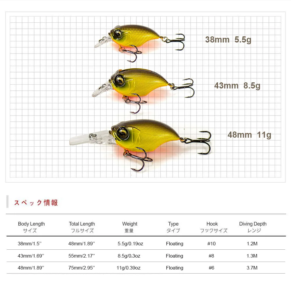 Size 1: 38mm (1-1/2"), 5.5g (3/16 oz.) , Hook Size: #10, Diving Depth: 1.2m (4')