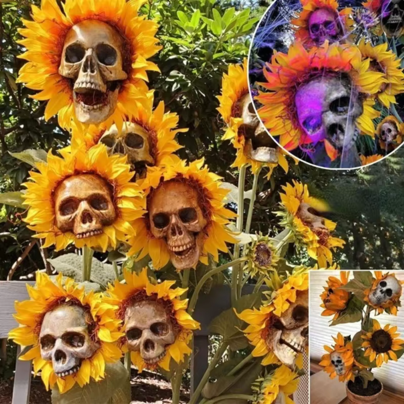 Cráneo espeluznante Flores de girasol Cráneo Festival Arte Artesanía Decoración de jardín Simulación Adornos de flores Decoraciones de HalloweenDecoración de jardín de calavera de girasol artificial, decoración de Halloween de esqueleto de plantas de simulación al aire libre, estaca de patio de césped emocionante, adorno de escena de terror