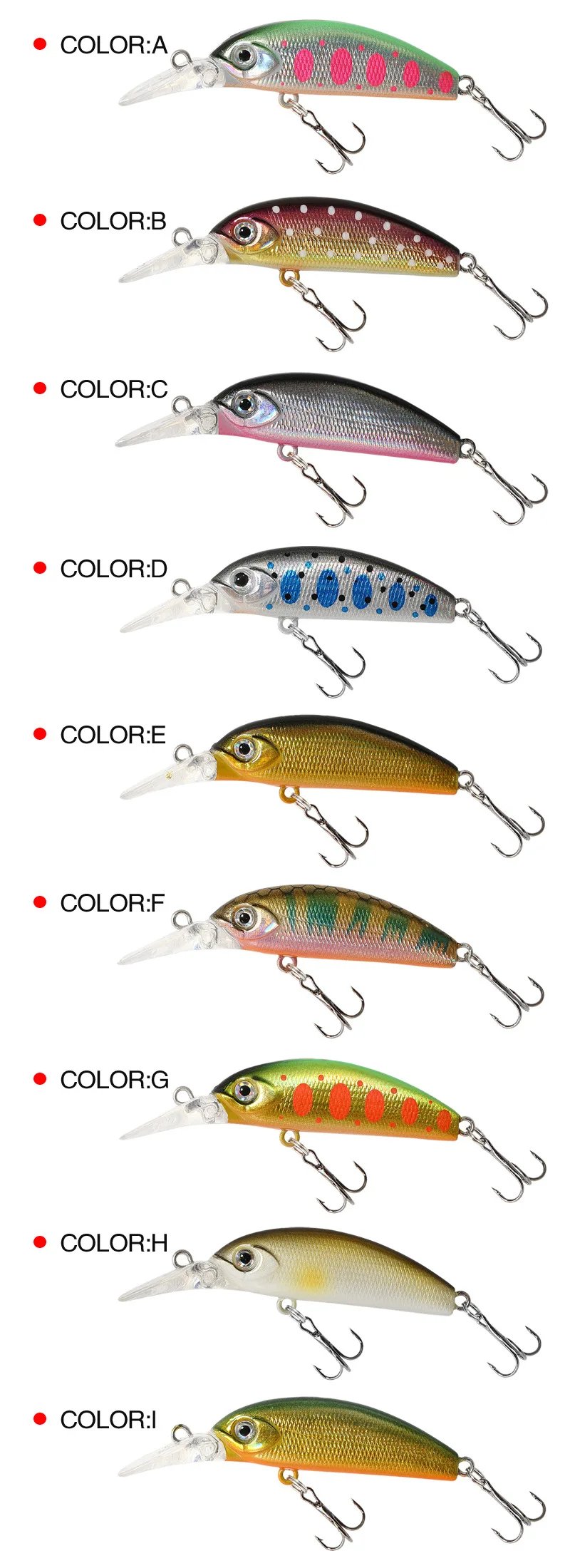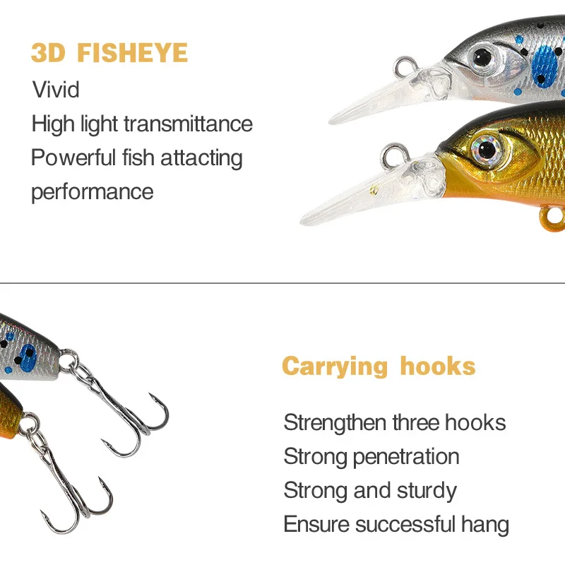 Características del producto: 1. El cuerpo del cebo adopta materiales avanzados de protección del medio ambiente, no solo tiene una alta resistencia al impacto, sino que también no produce sustancias nocivas para el medio ambiente. 2. El cebo está diseñado para tener el mejor equilibrio para que el cebo pueda nadar a la velocidad de recuperación más lenta posible. 3. Los cebos tienen una pintura realista y ojos 3D vívidos, hacen que el cebo parezca un pez real nadando en el agua durante la pesca. 4. Cuerpo colorido: Diseño de simulación, más atractivo para los peces. 5. Ganchos: anticorrosión, potencia más fuerte, duradero, agua de mar de agua dulce universal. 6. Piel de pez de simulación (láser): el diseño de piel de pez de simulación lo hace más atractivo para los peces grandes.