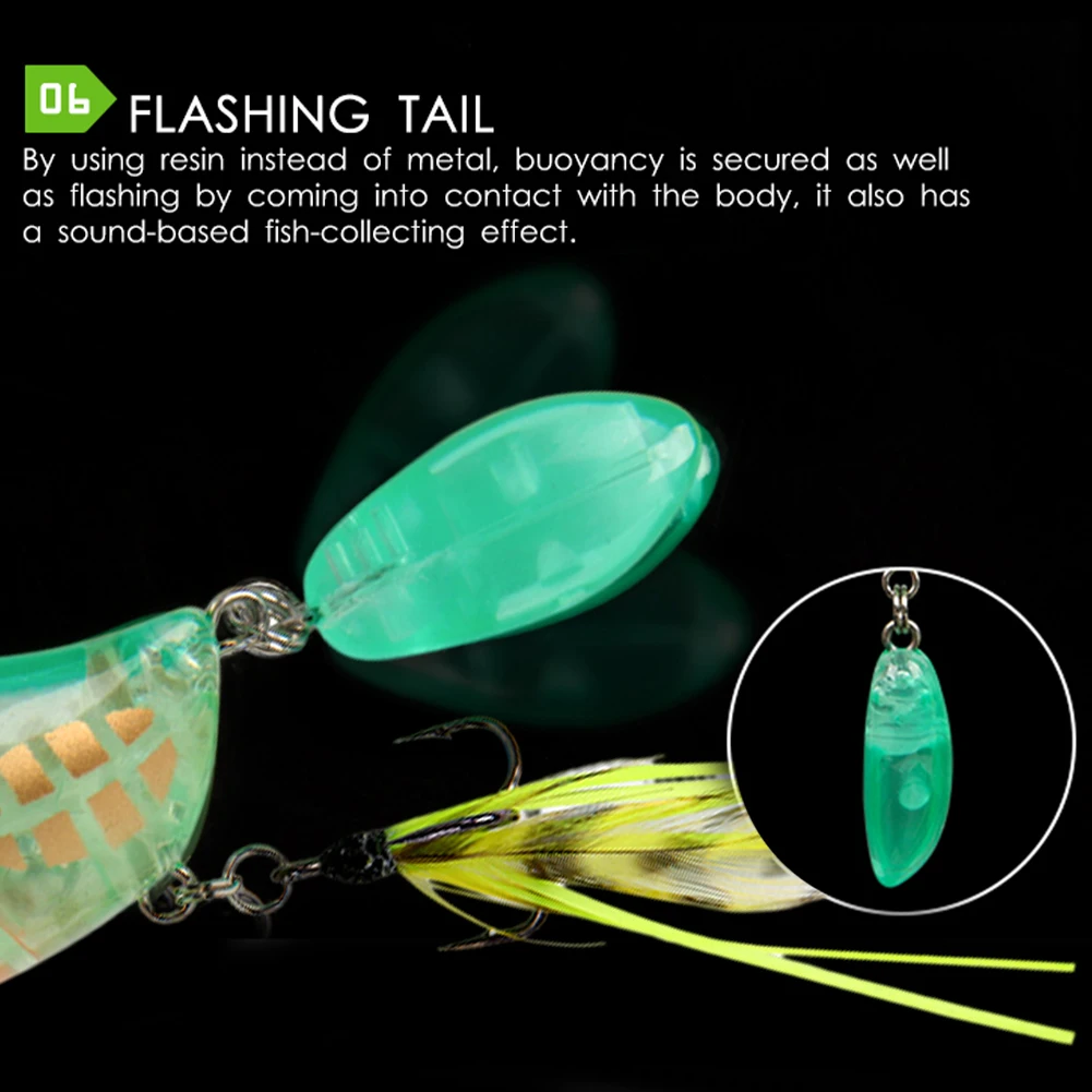 * 6. Al usar resina en lugar de metal, la flotabilidad está asegurada, así como el parpadeo al entrar en contacto con el cuerpo, también tiene un efecto de recolección de peces basado en el sonido.