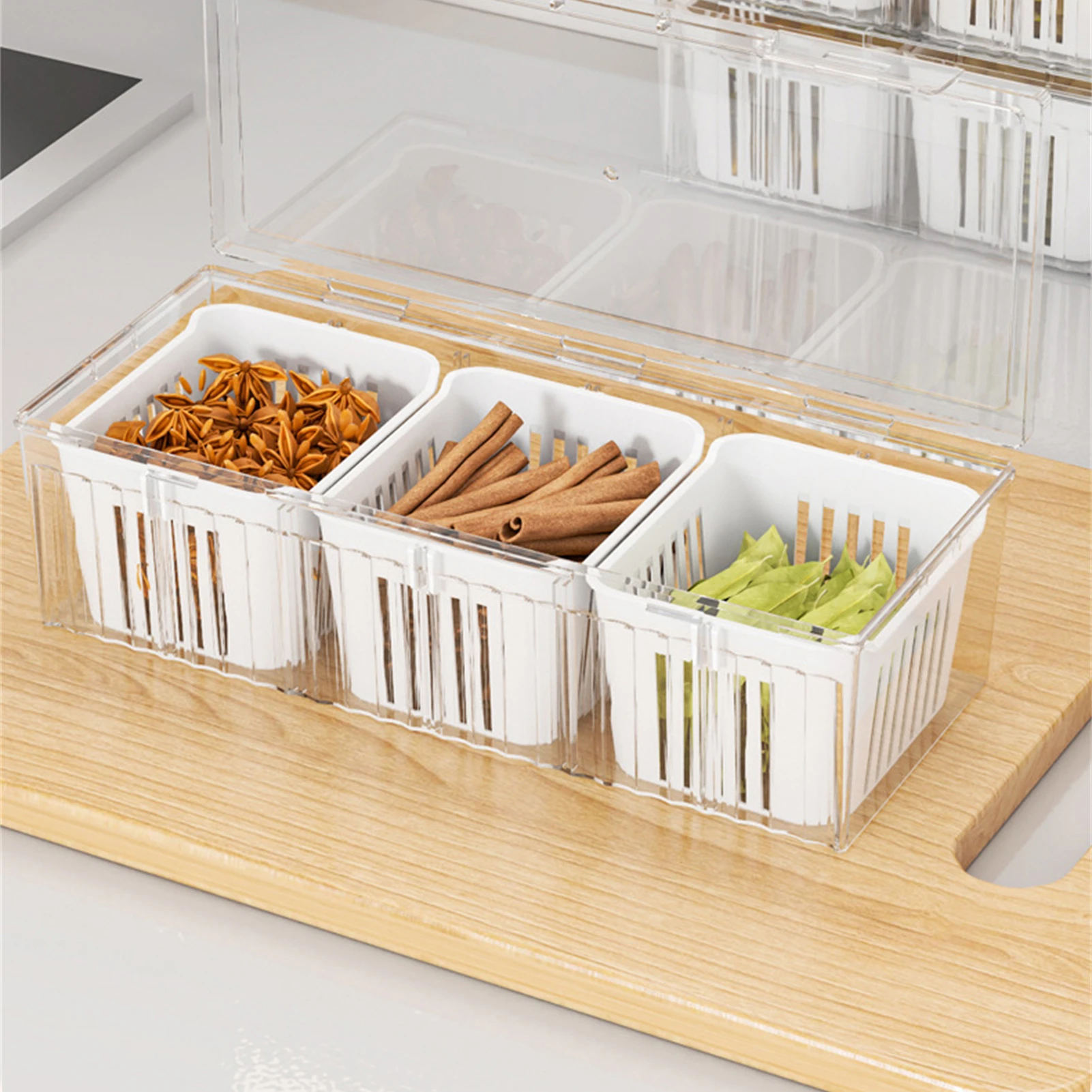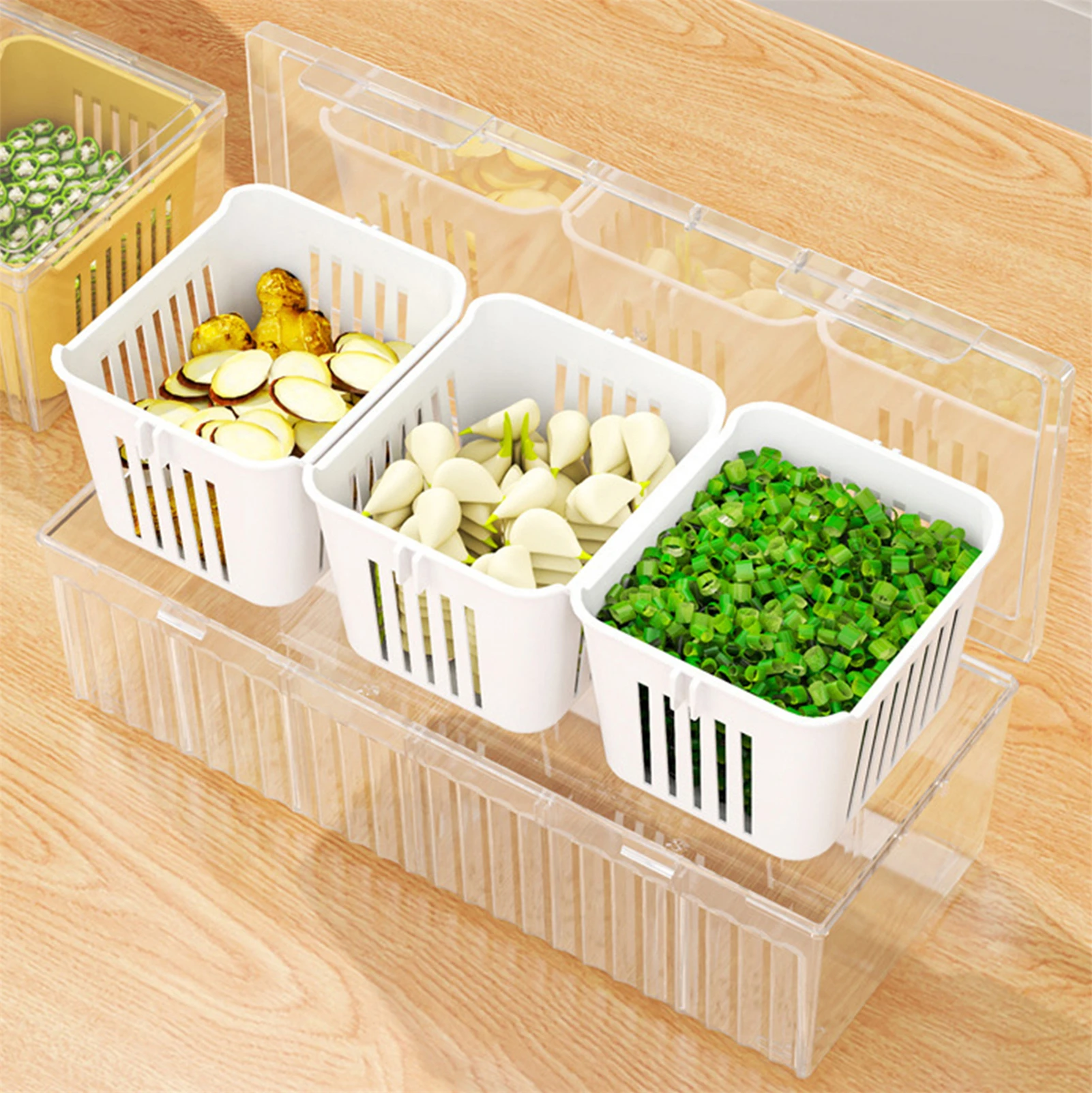 Solución de almacenamiento segmentada: la caja fresca de alimentos hermética segmentada para refrigerador es perfecta para organizar el jengibre picado, el ajo y la cebolla por separado.Cada compartimento cuenta con tapas herméticas para mantener la frescura y evitar que se mezclen los olores.