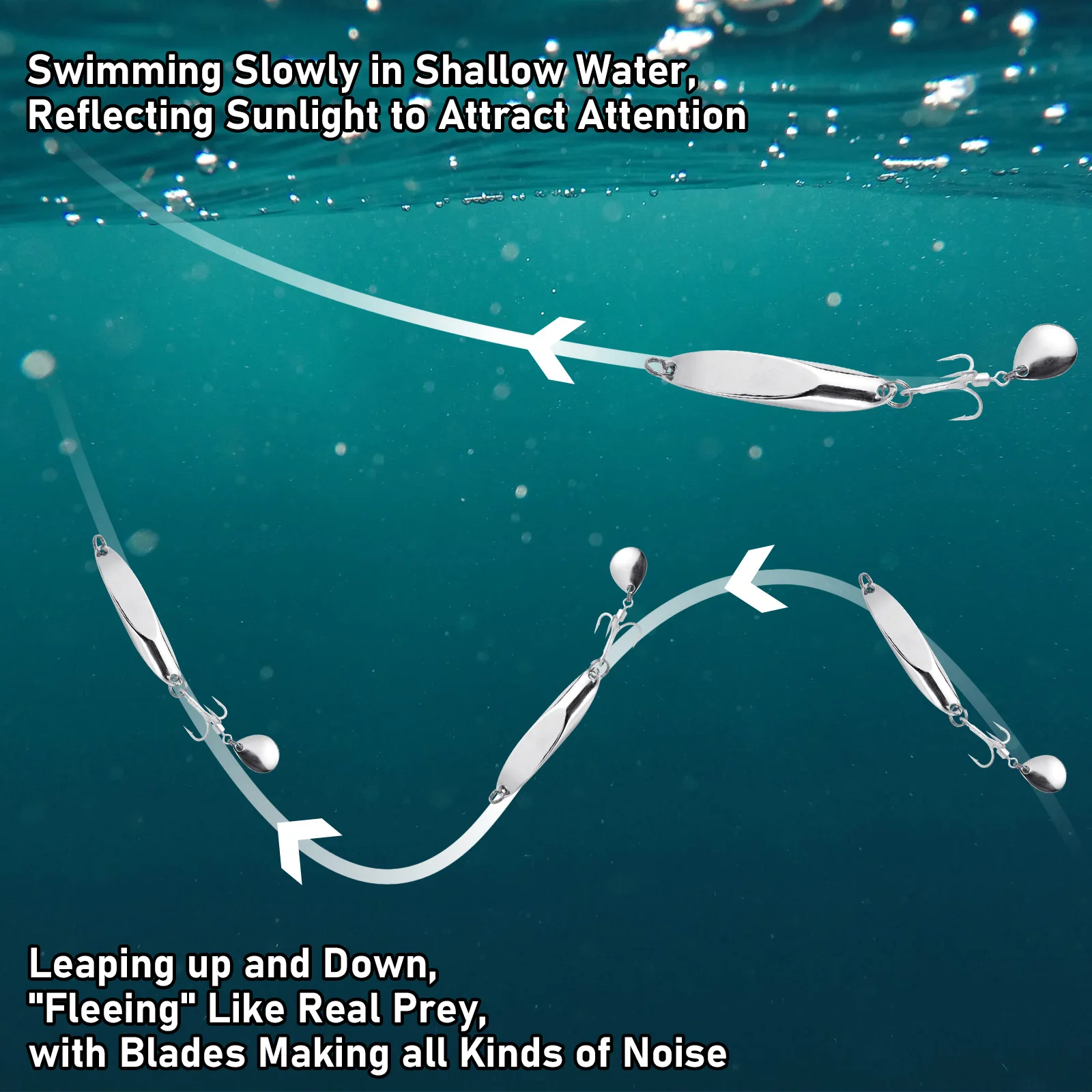 3. La pequeña hoja de nuestra cuchara es buena para hacer ruido, creando un sonido sutil y atractivo que atrae aún más a los peces depredadores.