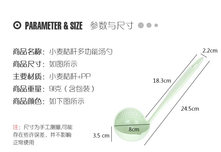 Color: rosa, azul, verde, beige 100% nuevo y de alta calidad Temperatura segura: -20-+120 centígrados Tamaño: 24,5 cm / 7,5 cm de longitud Tipo: Cuchara de sopa de mango largo Material: plástico PP Embalaje: 1 cuchara coladora