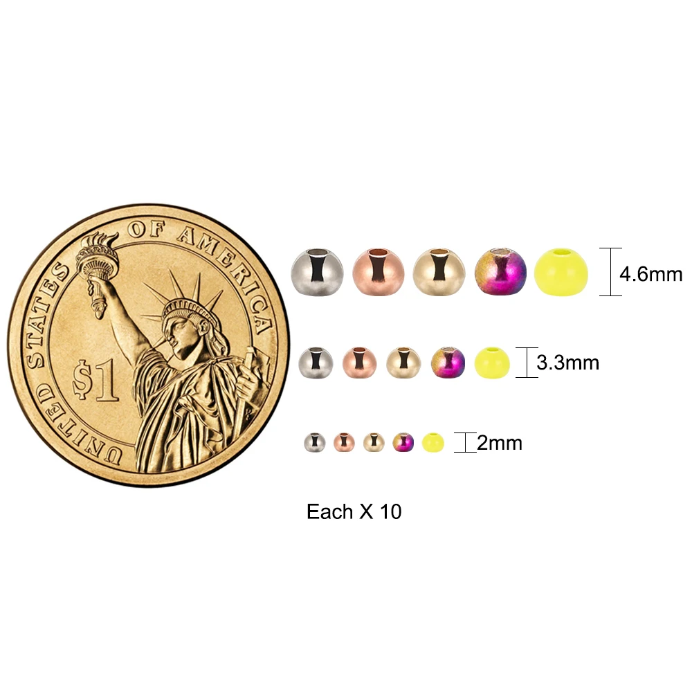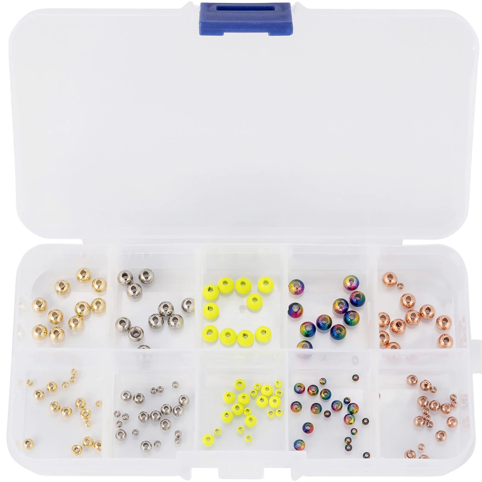 Los tamaños de las cuentas de atado de moscas son 2mm, 3,3mm y 4,6mm, y tienen 5 colores, cada tamaño/color 10 cuentas. Este surtido contiene un total de 150 cuentas de tungsteno.