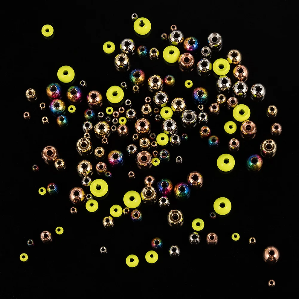 Una variedad de cuentas de tungsteno con los tamaños más utilizados y los colores más productivos para la pesca con mosca.