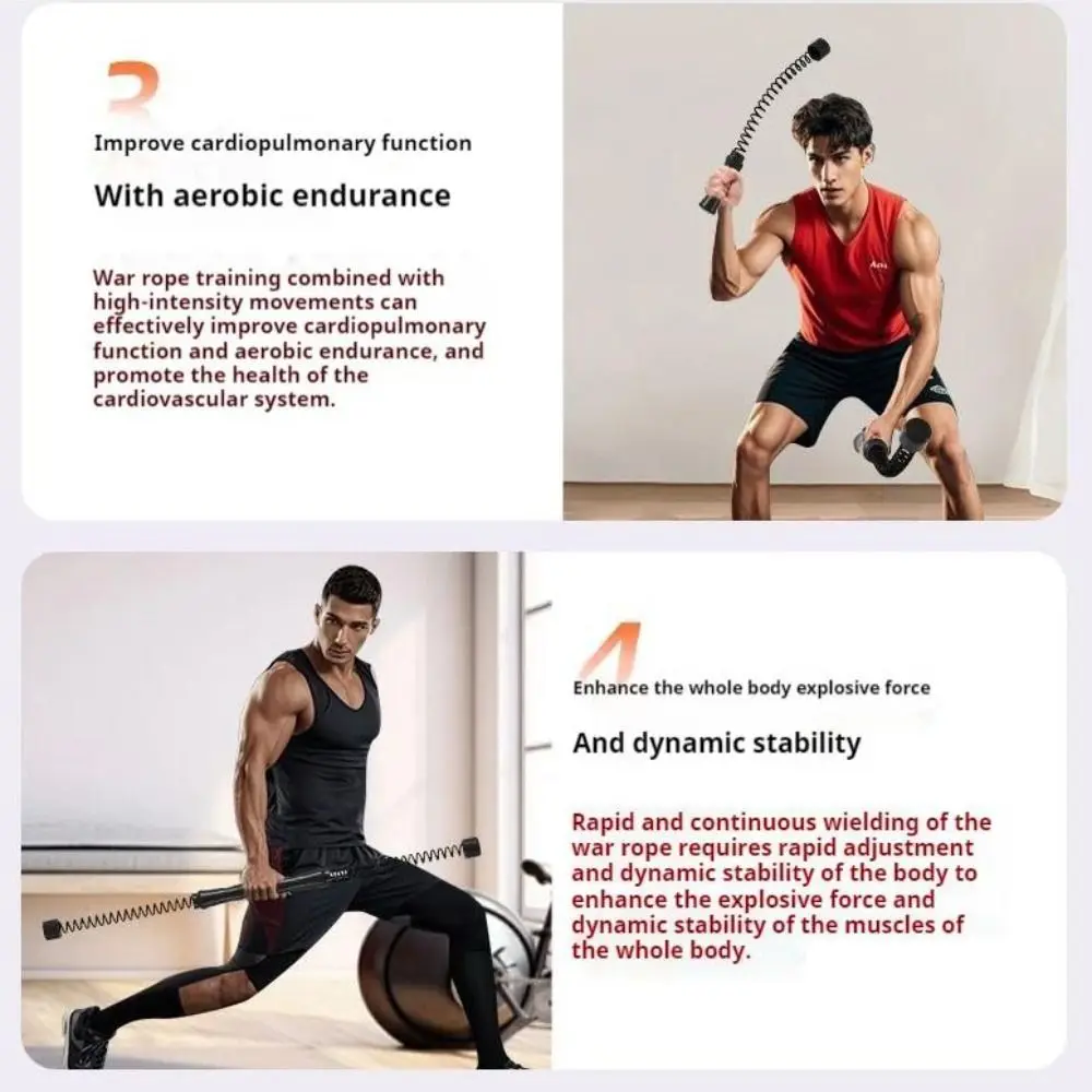 2. Simulate the original battle rope action and improve the training effect: This cordless battle rope is designed to simulate the traditional battle rope action. Even without the long rope structure of the traditional battle rope, it can still replicate the classic wave, swing and other battle rope training actions through the rebound force and toughness of the spring, helping users to efficiently exercise the core muscles, arms, shoulders and legs.