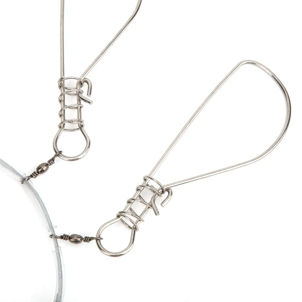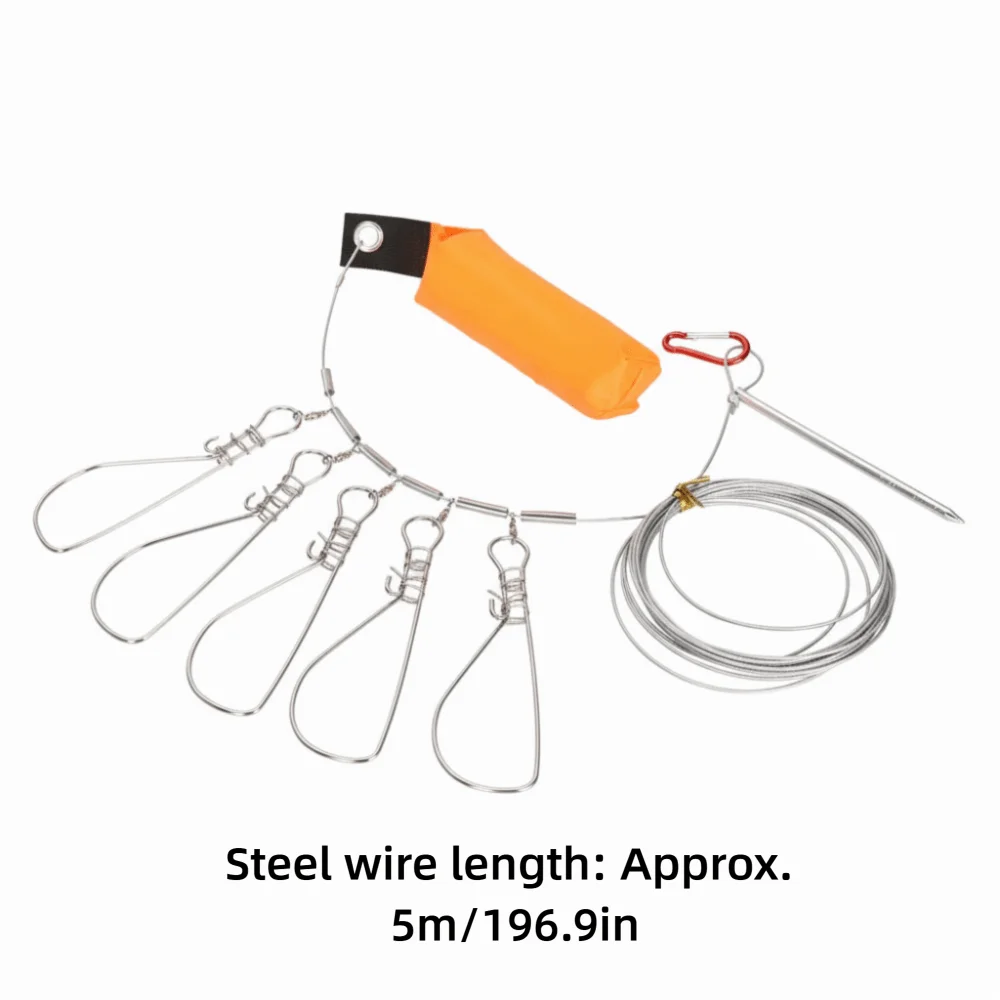 Longitud generosa para mayor versatilidad: con una longitud de alambre de acero de aproximadamente 5 metros (196.9 pulgadas), esta larguera ofrece una longitud amplia para acomodar múltiples capturas sin abarrotar, lo que la hace adecuada para una variedad de escenarios de pesca, desde pesca en el mar hasta el hielo y en kayak.