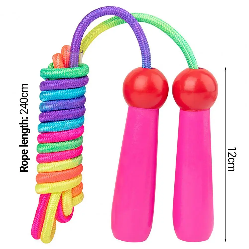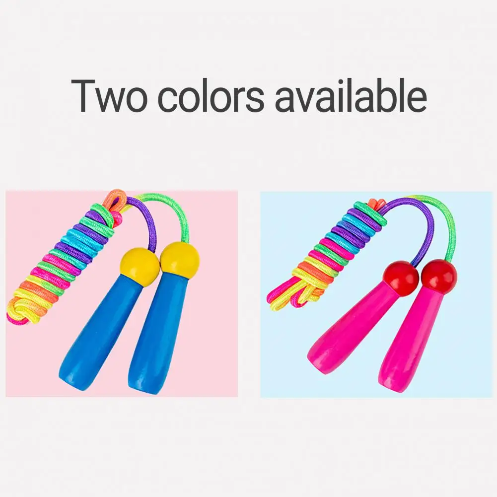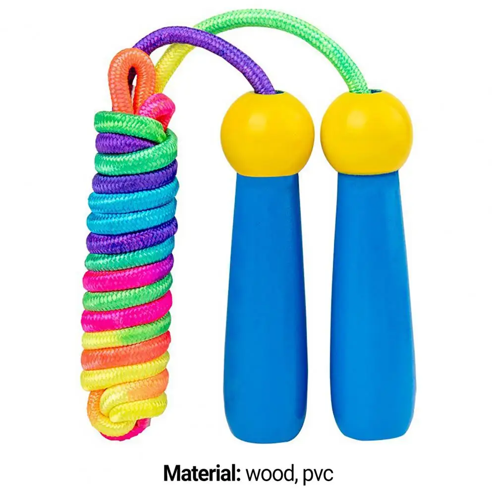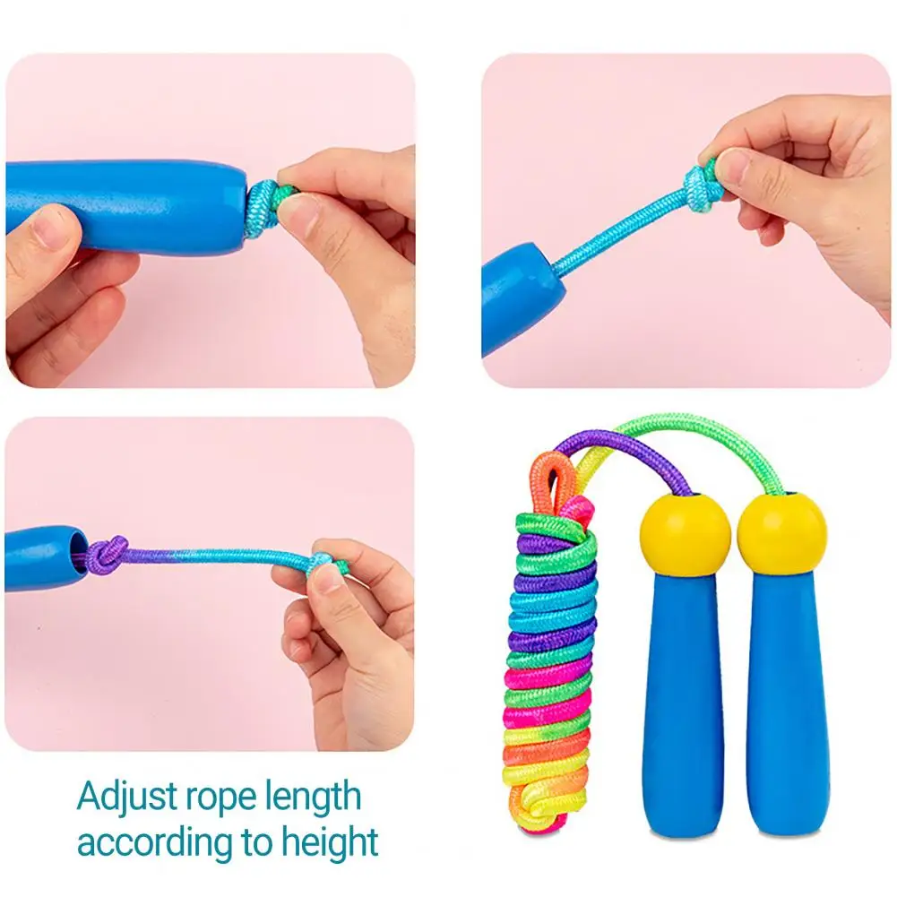 Diseño ergonómico, cuerda para saltar para niños sin enredos, estampado de rayas de arcoíris, mango de madera, cuerda para saltar de longitud ajustable, artículos deportivos