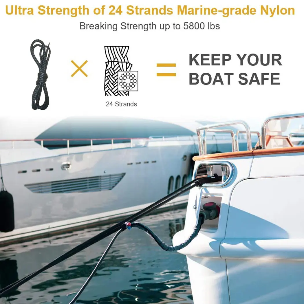 ULTRA fuerza: las líneas del barco están trenzadas doble de 24 hebras de nylon de grado marino. La carga de trabajo segura es de 790 libras y la fuerza de ruptura es de 5800 libras. Las líneas de muelle de 11 'x 3/5 "están muy acondicionadas para el atraque y amarre de barcos pequeños a medianos de hasta 25'. Estas cuerdas también se pueden utilizar fácilmente junto con guardabarros de barco o parachoques. Además, también es perfecto para transportar mercancías y tirar de carros, etc.