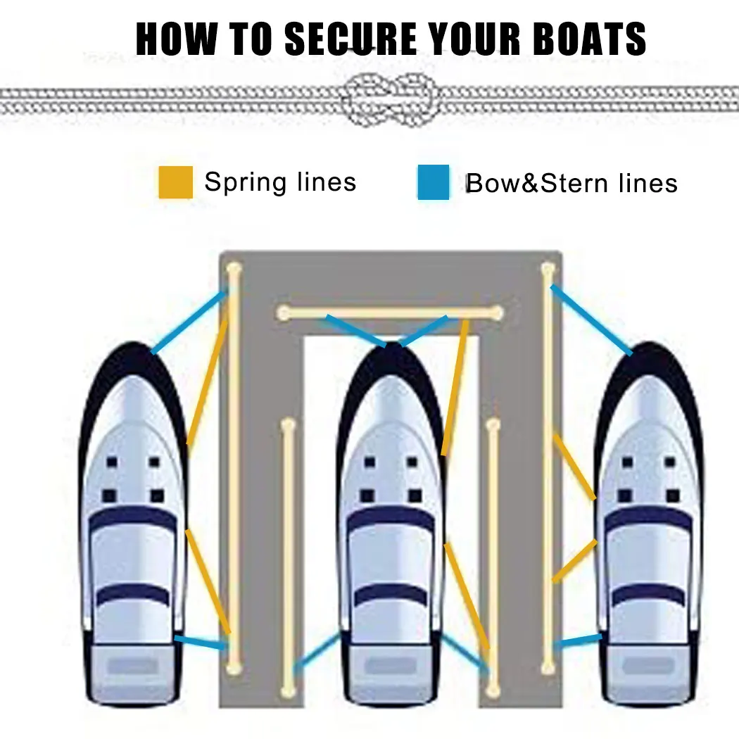 Estructura de doble trenzado: la estructura de doble trenzado tiene máxima durabilidad, elasticidad y absorción de golpes. Más refinado, 25-30% más fuerte que comparable. Asegure su barco incluso en olas altas y áreas de muelle rugosas.