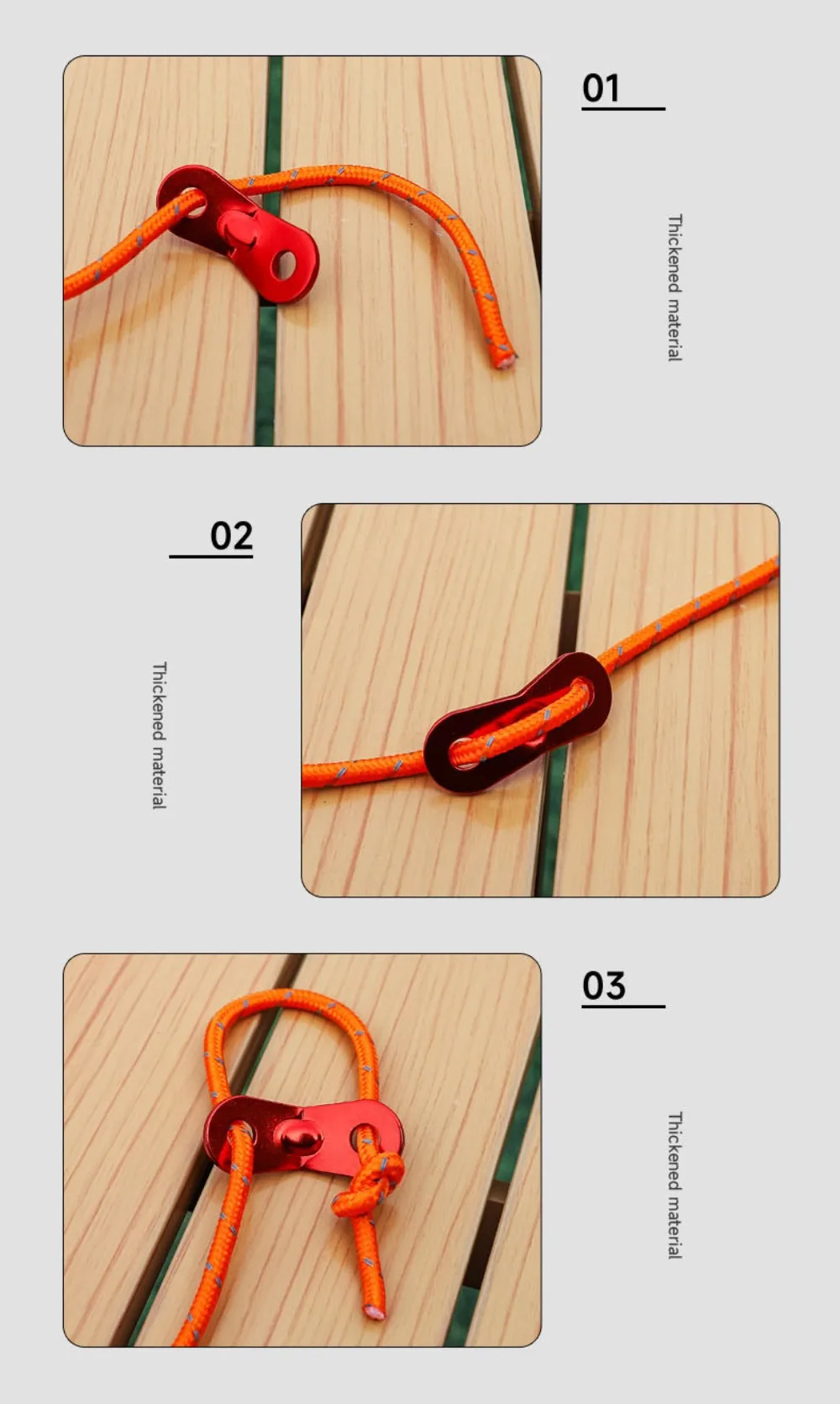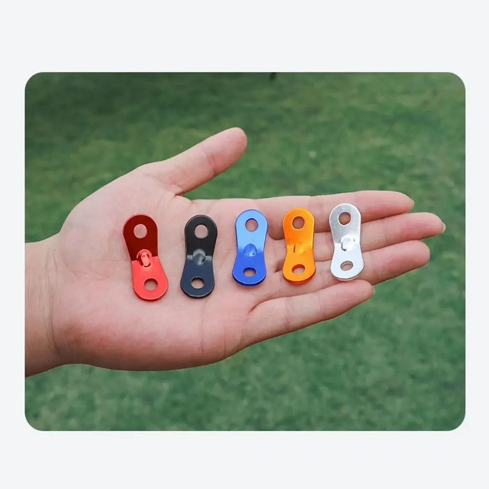 Cantidad: 1 juego a su elección Hebilla ajustable de doble ojo de aleación de aluminio, dosel fijo para tienda de campaña y otras cuerdas. La longitud de la cuerda se puede ajustar fácilmente para lograr un grado de tensión adecuado.Adecuado para cuerdas con un espesor inferior a 6 mm.
