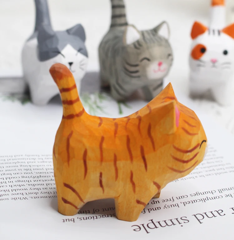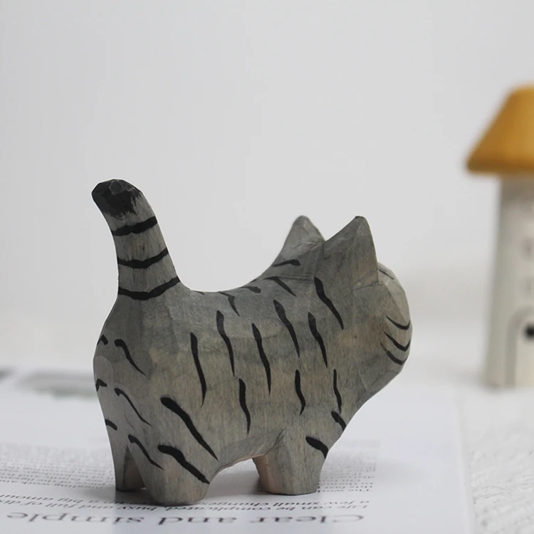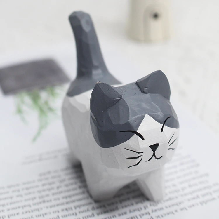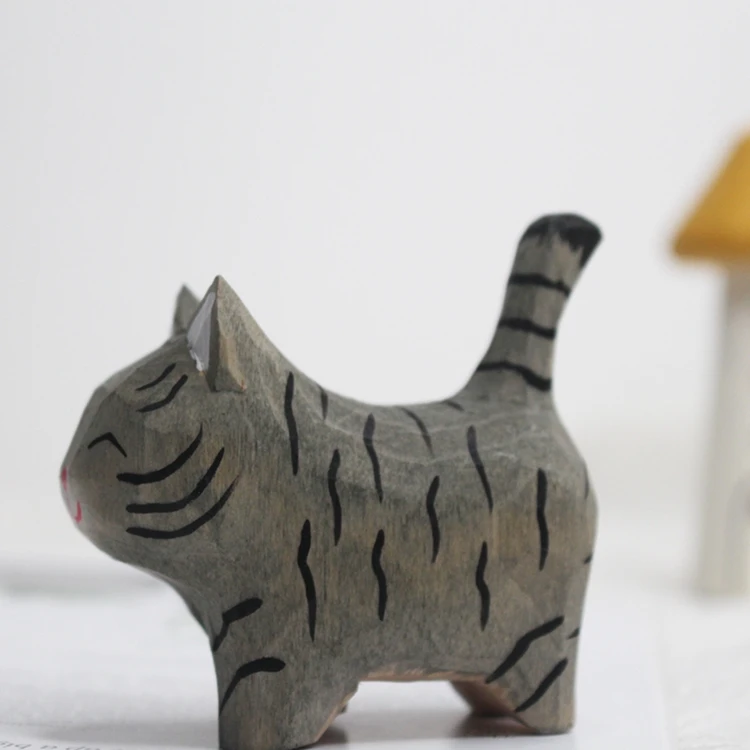 Cute Cat Shape Handmade Wood Carving Kitten Ornaments Small Animal Creative Desktop Wood Cat Decoration Crafts Ornament