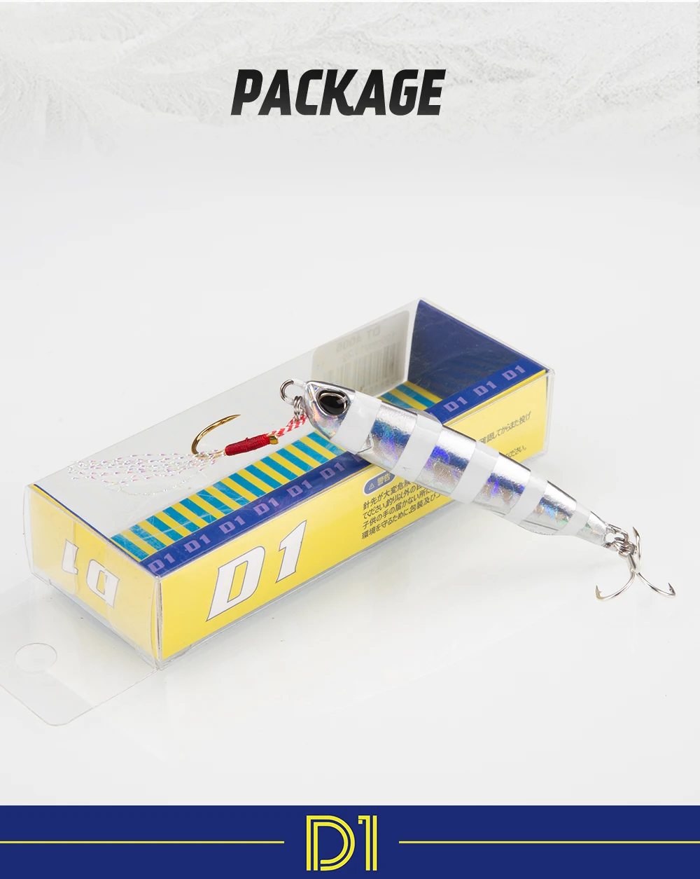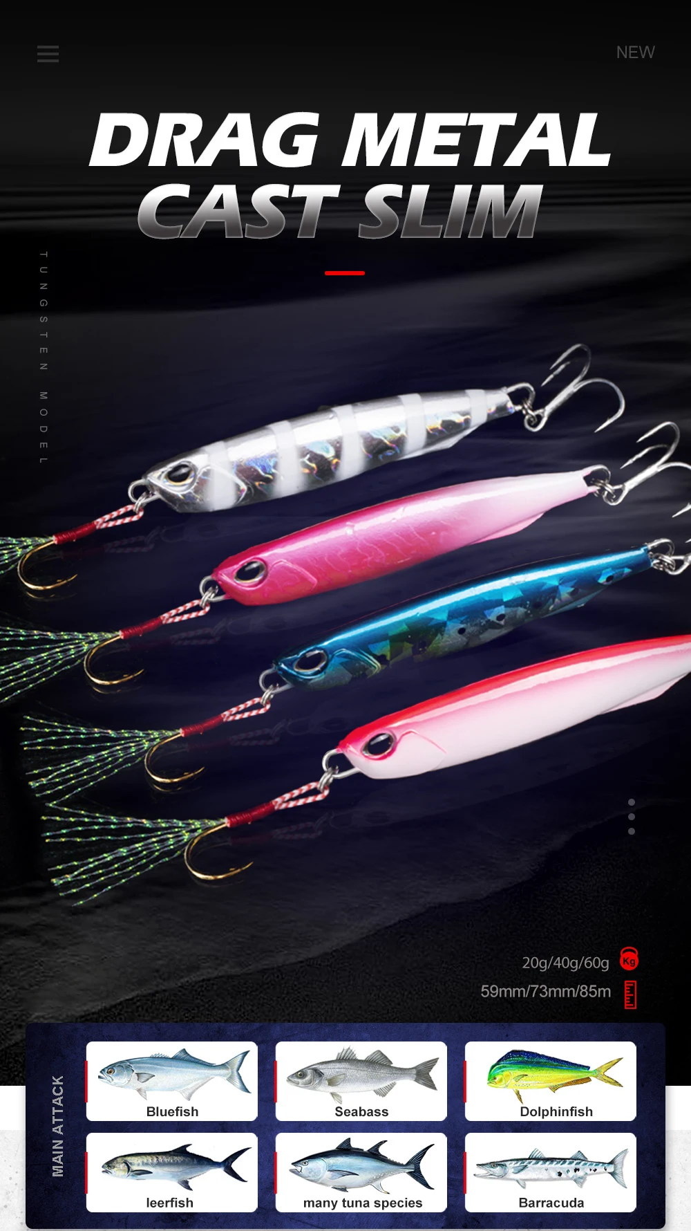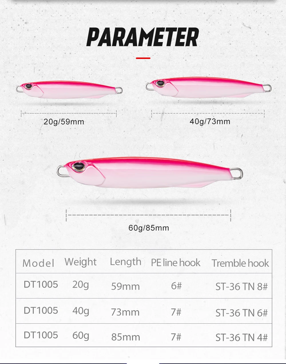 1. Número de modelo: DT10052. Tipo: señuelo Jig3. Peso: 40g 60g4. Longitud: 73mm 85mm5. Ojos: ojos 3D6. Cuerpo: cuerpo láser7. Pescado objetivo: Lubina, pez azul, trucha, lucio, perca GT