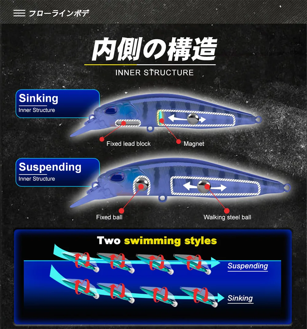 2. La vibración es causada por una acción de darting más apretada. El resultado es una acción mímica similar a un pez que huía. Esto activa el interruptor de alimentación para los bajos tan pronto como el señuelo entre en la vista incluso con una simple recuperación lenta ~ rápida.
