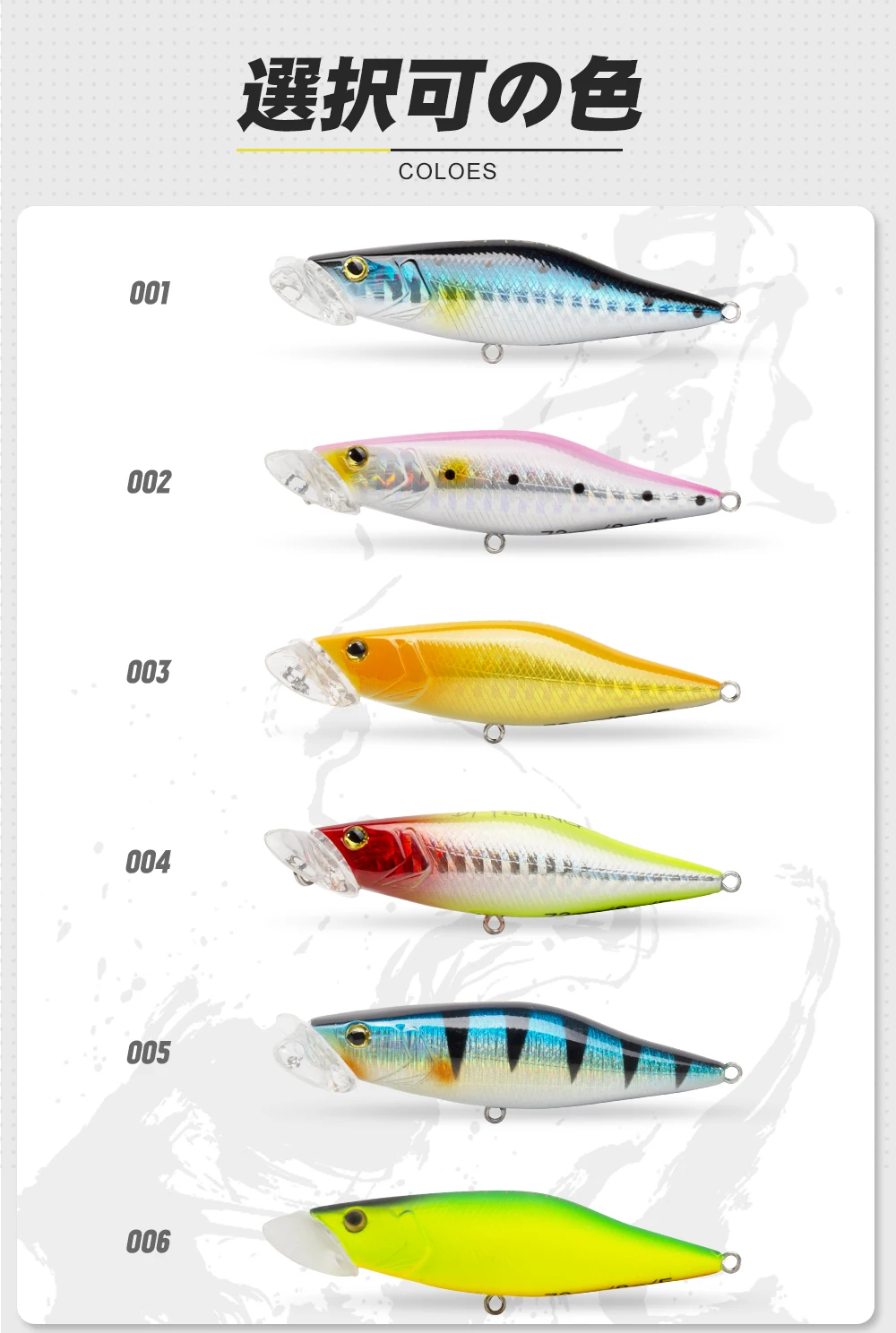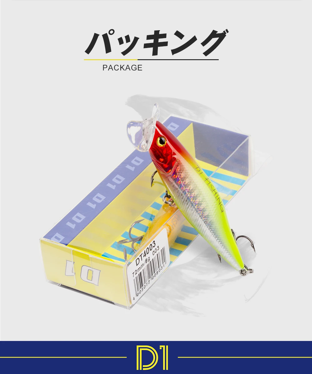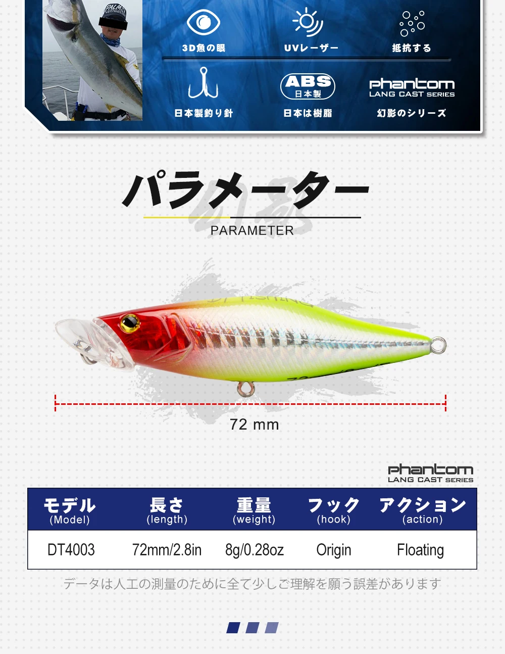 1. Longitud: (72mm)2. Peso: (8g)3. Tipo: flotante4. Categoría: cebos de superficie/oruga