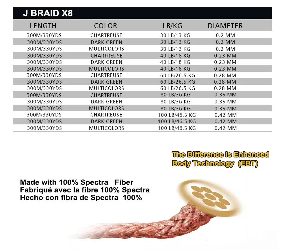 J-Braid está disponible en 3 opciones de colores; Chartreuse, verde oscuro y multicolor.La versión multicolor presenta 5 colores diferentes; Metido en incrementos de 10, 5 y 1 metro.