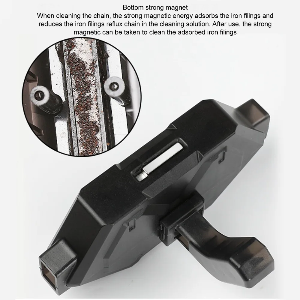Colector de partículas magnético: la parte inferior del limpiador de cadena está equipada con una tira magnética que atrae las partículas que se desalojan de la cadena durante la limpieza.Esto evita eficazmente que se vuelvan a fijar a la cadena, asegurando un proceso de limpieza completo.