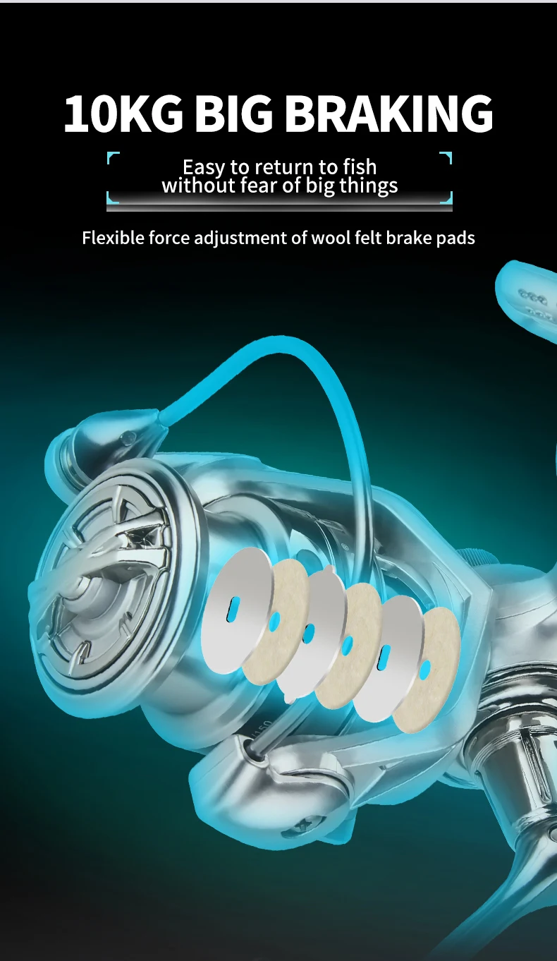 1. Fuerza súper grande de 8kg de frenado, fácil de devolver a los peces, sin miedo a los objetos grandes; Pastillas de freno de fieltro de lana, ajuste flexible de la fuerza de descarga; Duradero y resistente, con frenos de alta resistencia