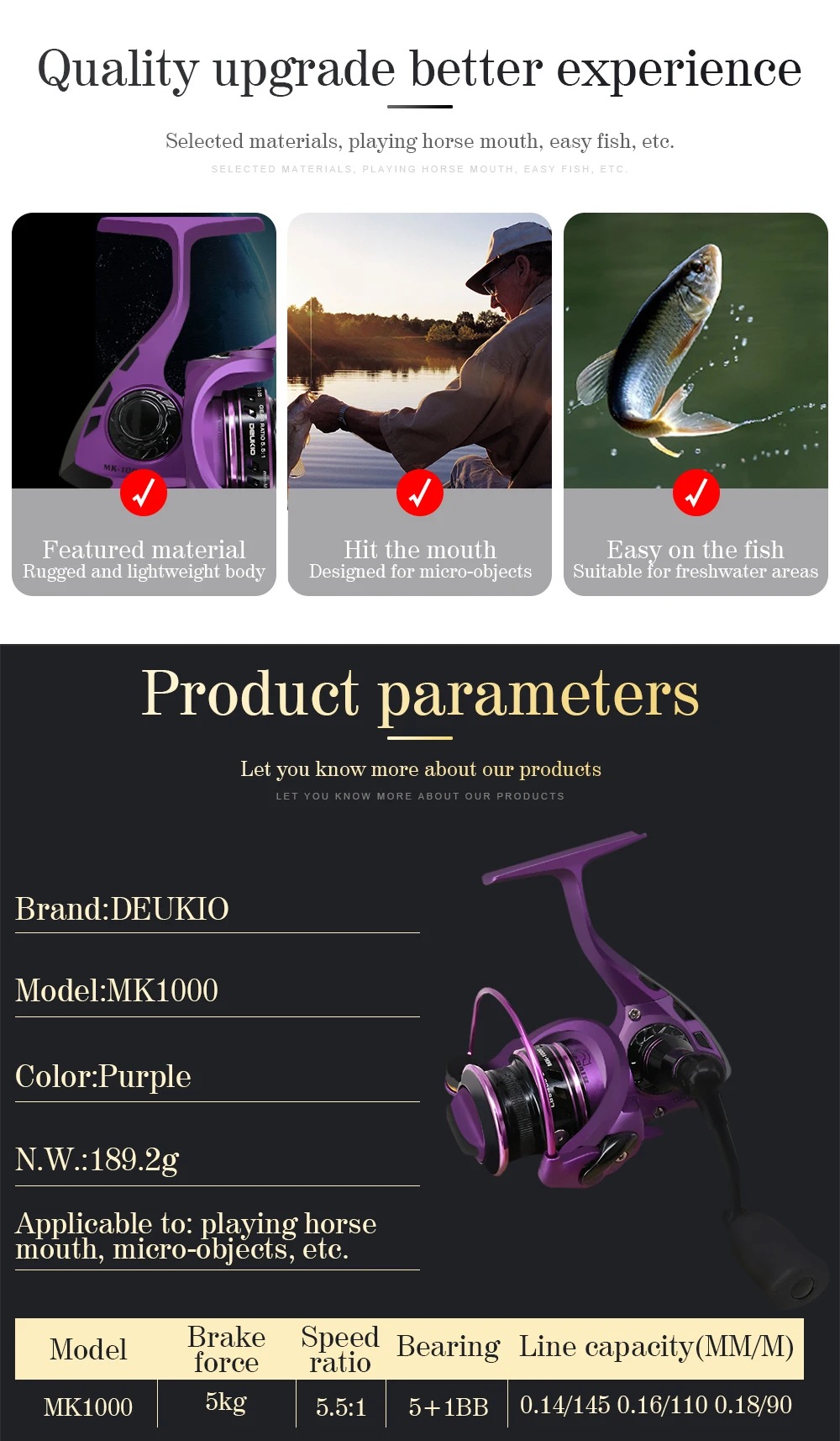 DEUKIO-carrete de pesca giratorio serie Micro 1000, 5 + 1BB, arrastre máximo, 5KG, para agua dulce y salada
