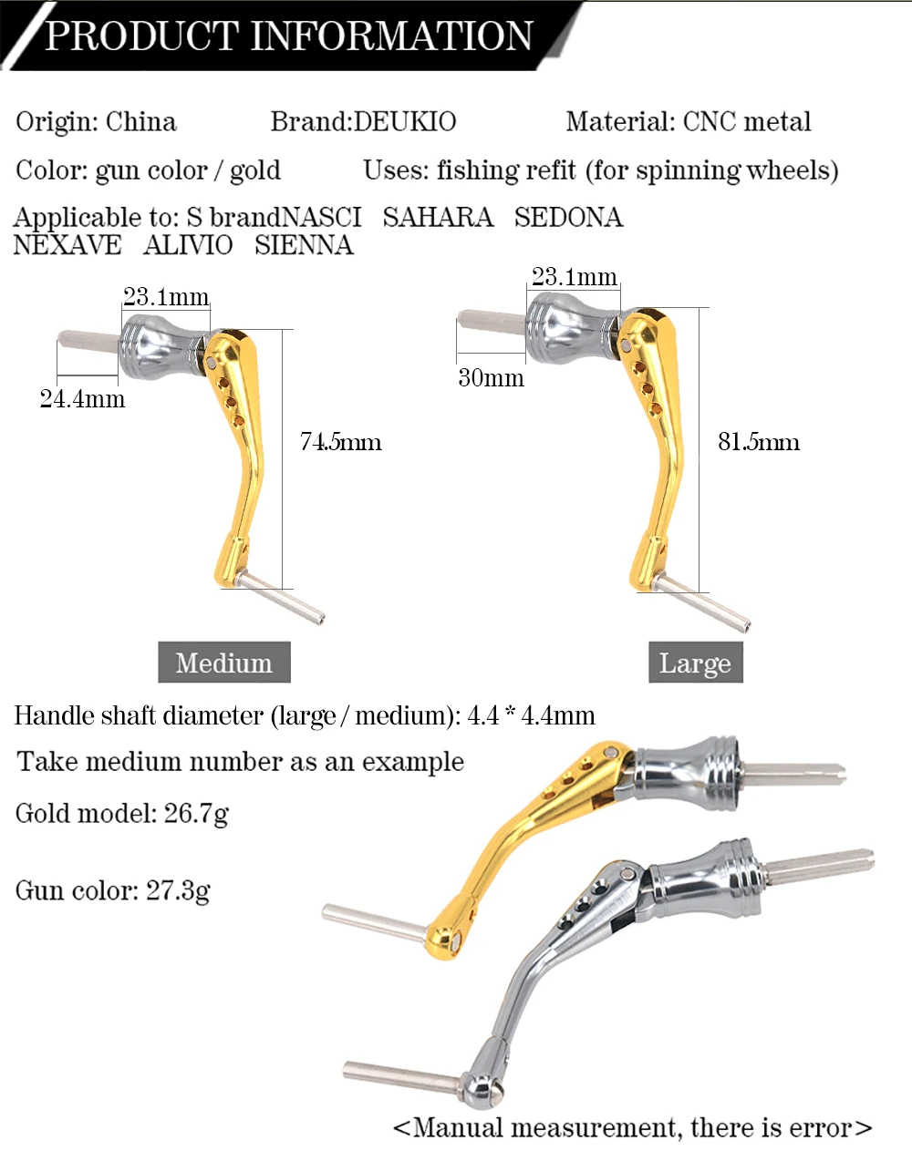 El tamaño mediano encaja perfectamente en Shimano Nexave 2500 FC y, muy probablemente, también en el tamaño 3000, ya que tiene el mismo tamaño de cuerpo, pero solo un carrete más grande. En realidad, es de mayor calidad que el mango original, que está hecho de plástico y es un poco más corto (imagen adjunta para comparar). No tiene juego perceptible en la articulación del mango ni en el engranaje principal. Es obligatorio utilizar el tornillo del mango suministrado con el mango, ya que el tornillo original es más grueso. Asegúrate de poner una gota de aceite o grasa, porque el tapón de rosca tiene menos abolladuras que el tapón original y se vuelve difícil de desenroscar si se atasca. El eje de la perilla se adapta a rodamientos de bolas de 4x7x2,5 mm y está roscado, por lo que se puede reemplazar fácilmente por uno más largo o con un kit de actualización de perilla. Gracias a Aliexpress, el paquete fue enviado a través de un servicio de mensajería de primer nivel en mi país, por lo que llegó sin problemas en 14 días.