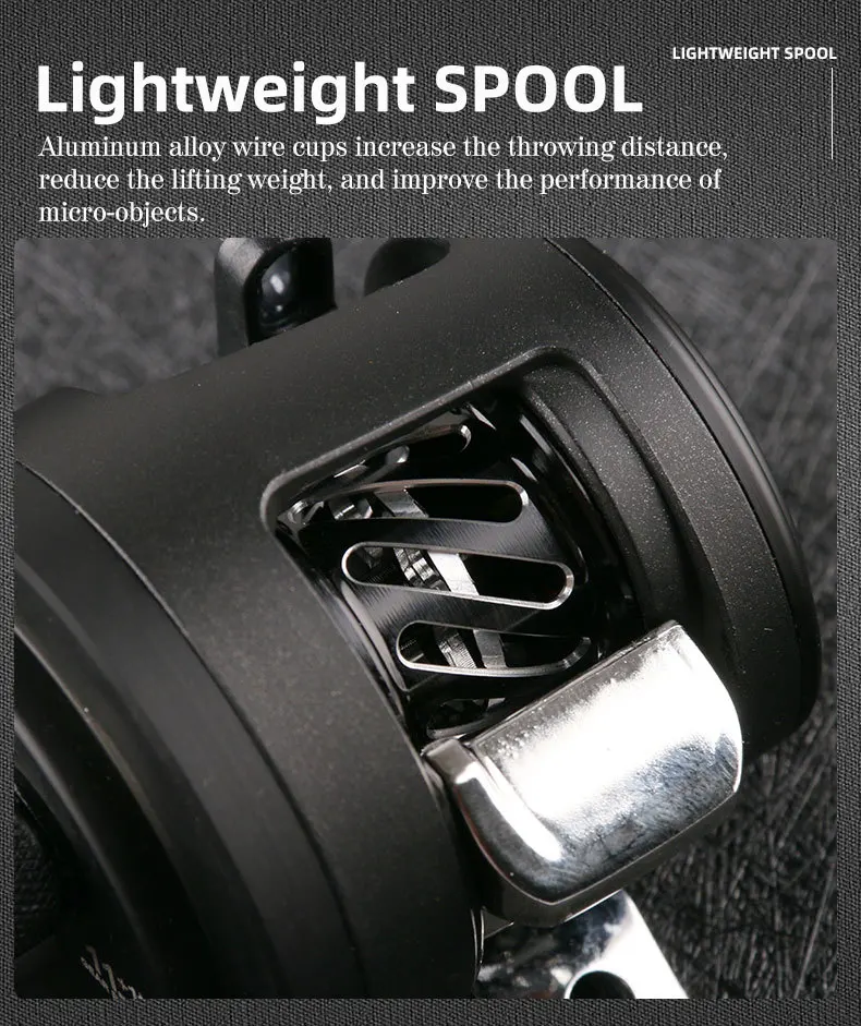 1. Carrete ligero: El carrete ligero de aleación de aluminio aumenta la distancia de lanzamiento, reduce el peso de lanzamiento y mejora el rendimiento de los microobjetos.Especificación: