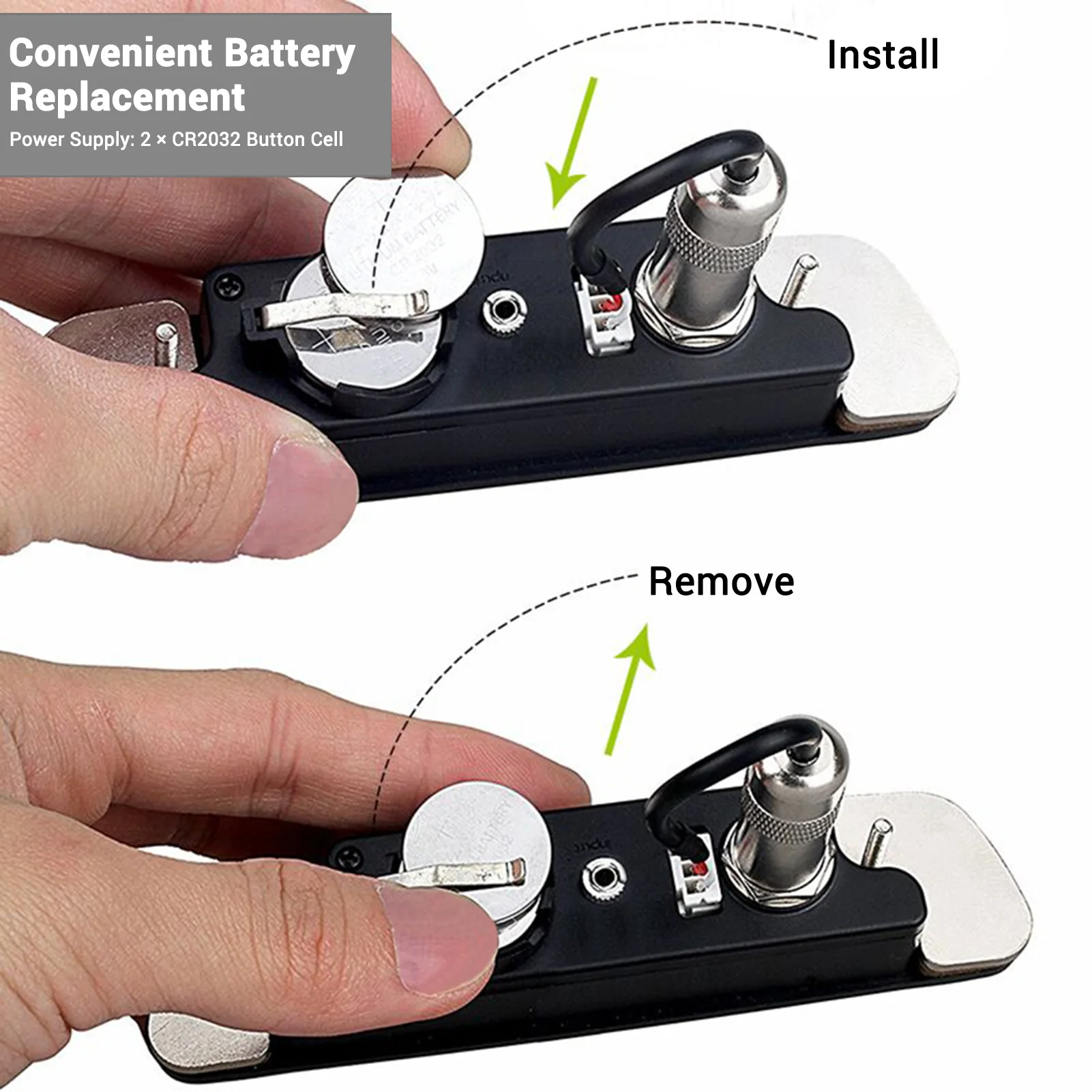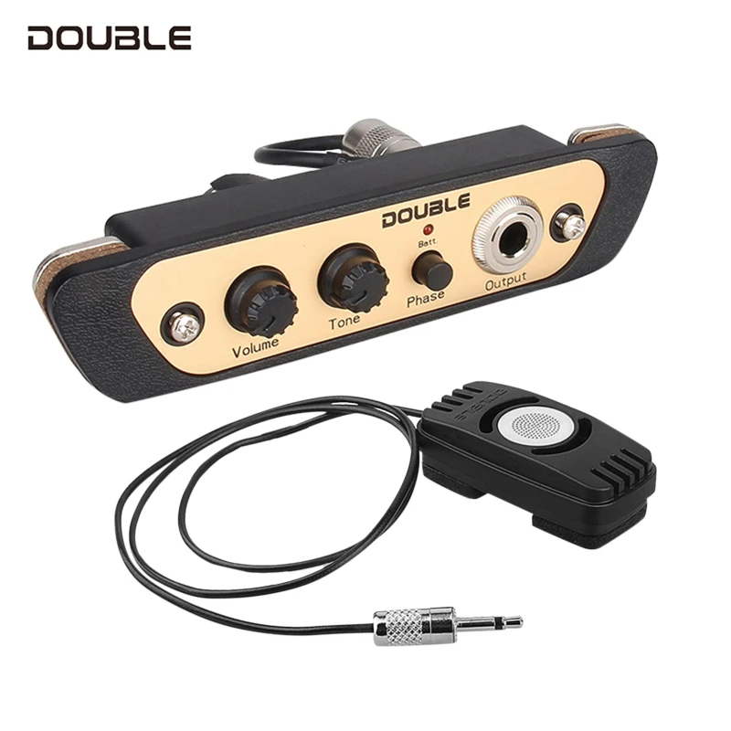 La pastilla, fácil de usar, conecta el módulo de micrófono incluido instalado en el panel superior interior del cajón mediante un puerto de micrófono, un amplificador externo mediante un conector de 1/4 de pulgada.