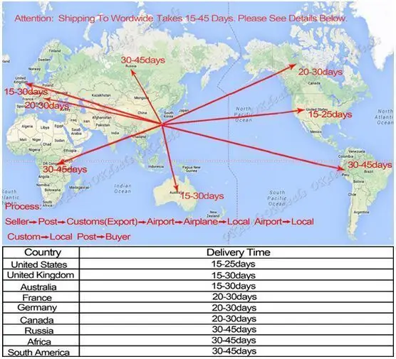 1. ENVÍO MUNDIAL. (Excepto algunos países y APO/FPO) 2. Los pedidos se procesan a tiempo después de la verificación de pago. 3. Solo enviamos a direcciones de pedido confirmadas. La dirección de su pedido debe coincidir con su dirección de envío. 4. Las imágenes que se muestran no son el artículo real y son solo para su referencia. 5. El TIEMPO DE TRÁNSITO del SERVICIO lo proporciona el transportista y excluye fines de semana y festivos. Los tiempos de tránsito pueden variar, sobre todo durante la temporada de vacaciones. 6. Si no ha recibido su envío en 30 días desde el pago, póngase en contacto con nosotros. Realizaremos un seguimiento del envío y nos pondremos en contacto con usted lo antes posible con una respuesta. ¡Nuestro objetivo es la satisfacción del cliente! 7. Debido al estado de las existencias y a las diferencias horarias, elegiremos enviar su artículo desde nuestro primer almacén disponible para una entrega rápida.