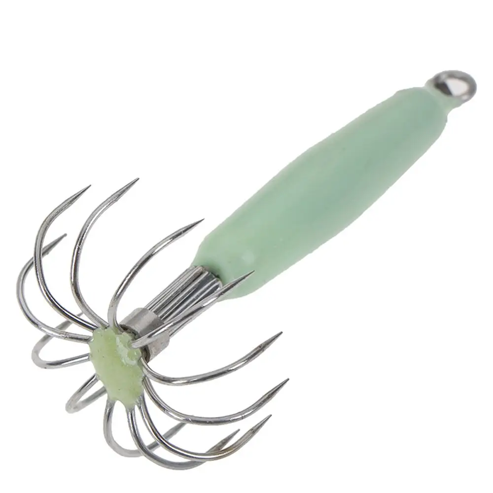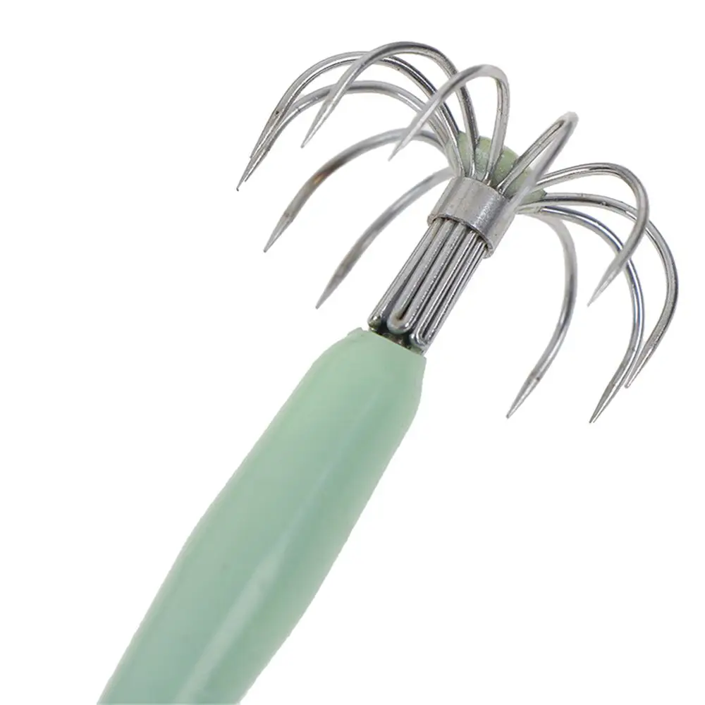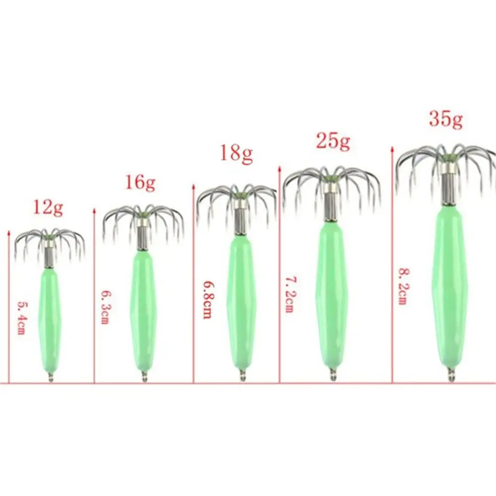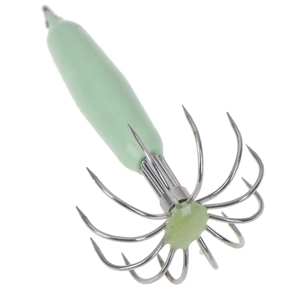 Color: Green Material: Stainless Steel -Length: appeox. 5.4cm / 6.3cm / 6.8cm/7.2cm Weight: 12g; 16g; 18g;25g Package Included:1 PC* Squid Hook. Features: This squid hook use 12 hook design, umbrella-shaped. It belongs to the broad-spectrum bait and is suitable for any waters. Hard body, with front ring to connect fishing line. Often used in cephalopods (octopus, squid, squid, etc.)